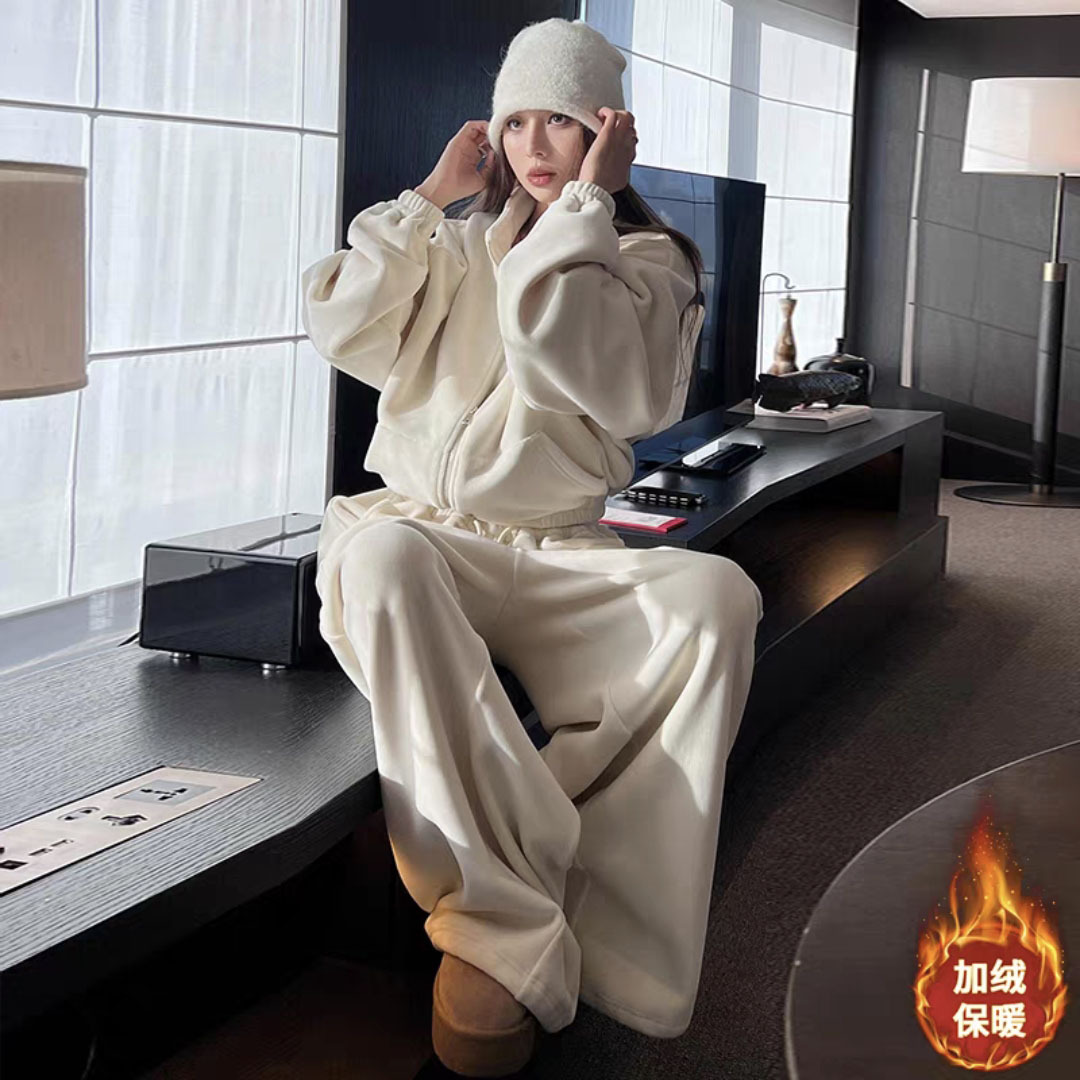 时尚休闲运动套装女秋冬连帽加绒加厚卫衣高腰阔腿裤高级感两件套