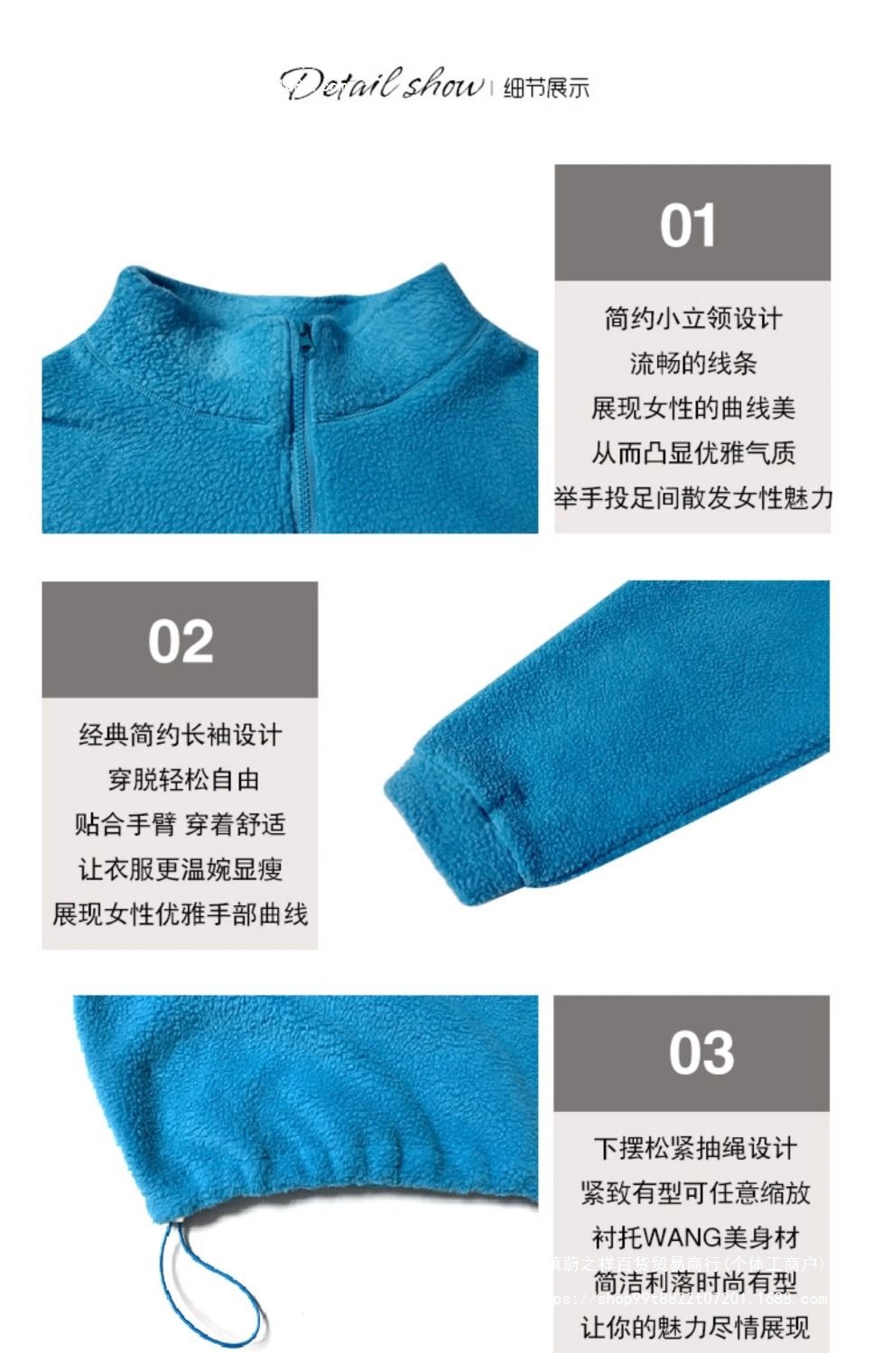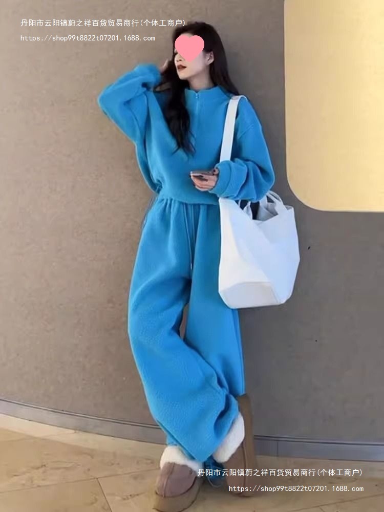 摇粒绒卫衣套装女秋冬加绒加厚蓝色短款立领运动外套阔腿裤两件套