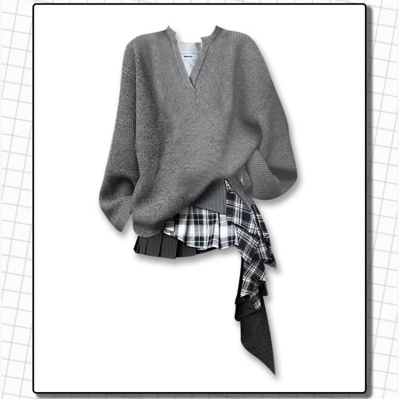 アメリカのギャルの灰色の偽の2つのゆったりしたセーターの秋冬の不規則なつなぎ合わせの格子のスカートの美しい2つのセット