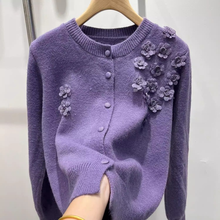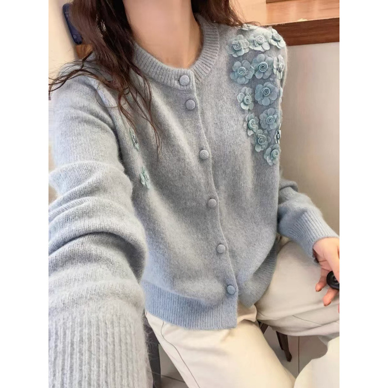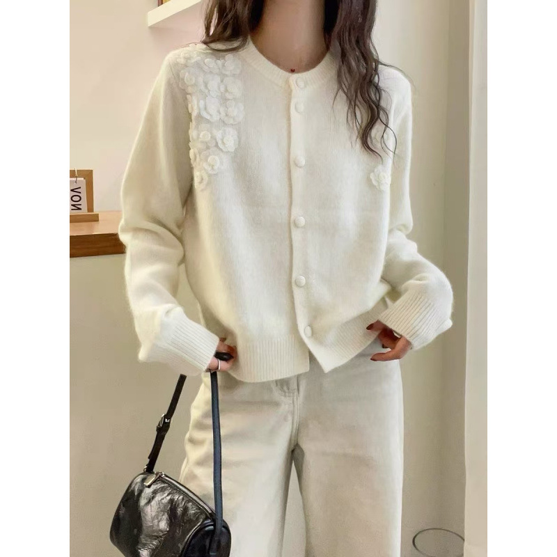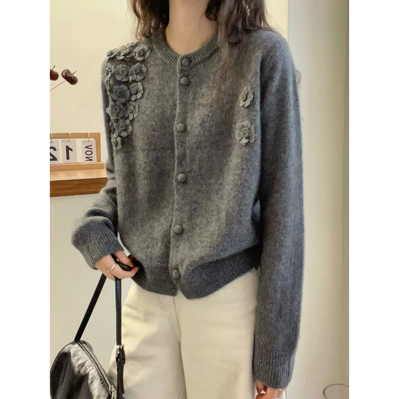 韩系秋冬新款立体花朵设计感文艺复古风针织衫圆领百搭毛衣女外套