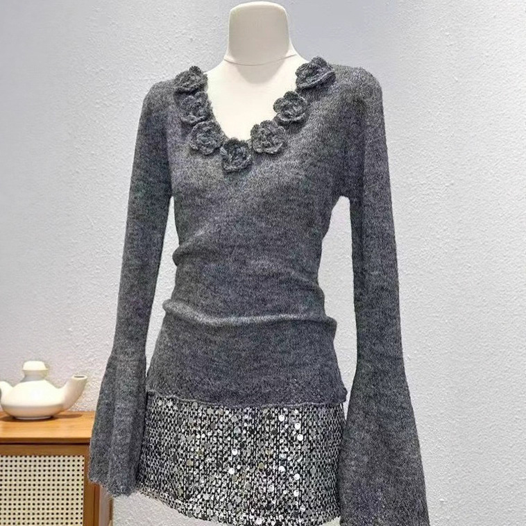 秋季新款立体花朵设计感长袖针织衫毛衣女套头气质通勤风修身上衣