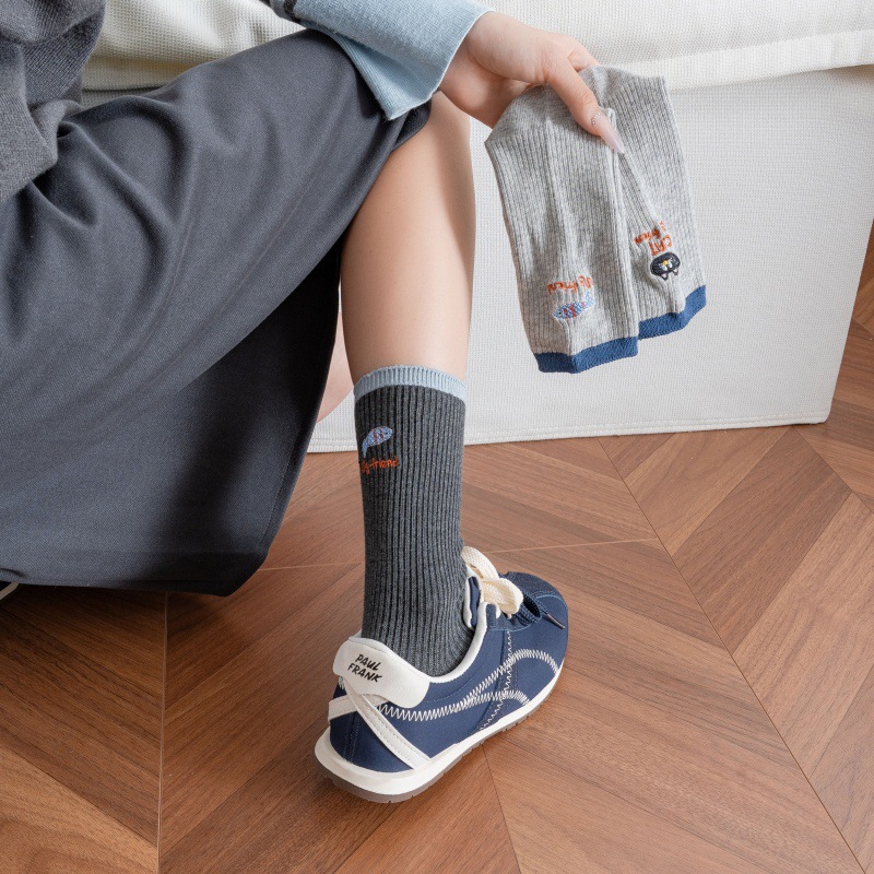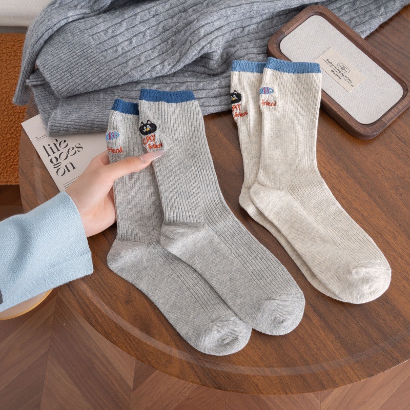 卡通刺绣双针袜子女AB款猫咪小鱼中筒棉袜拼色罗口ins潮流堆堆袜