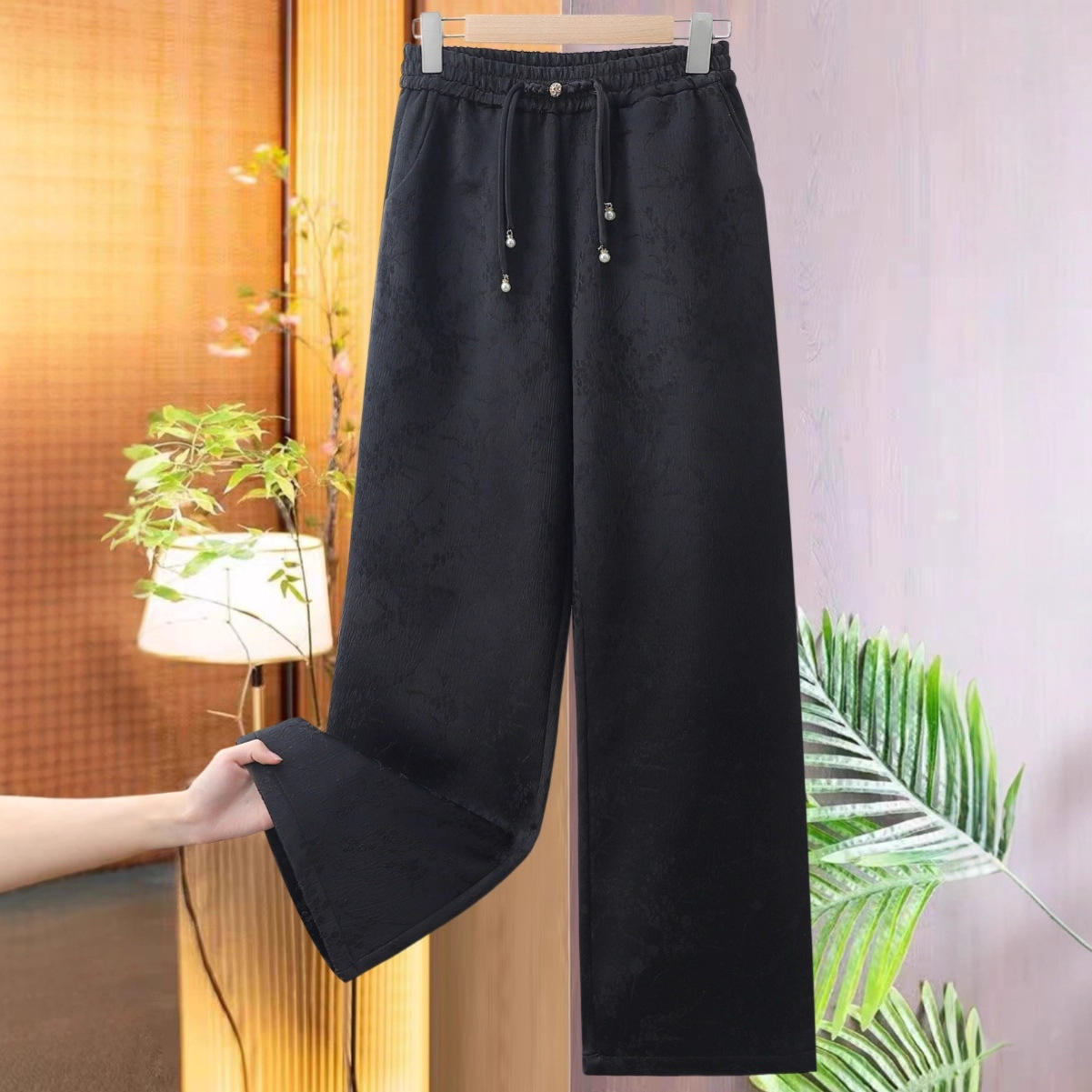 秋冬新款国风百搭高腰丝缎提花显瘦直筒裤女新中式加绒复古阔腿裤