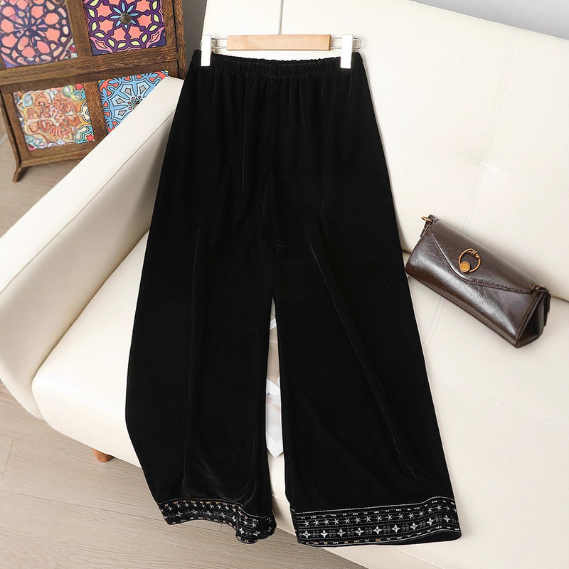 简约百搭黑色丝绒直筒裤女洋气绣花中式国风长裤秋装显瘦遮肉裤子