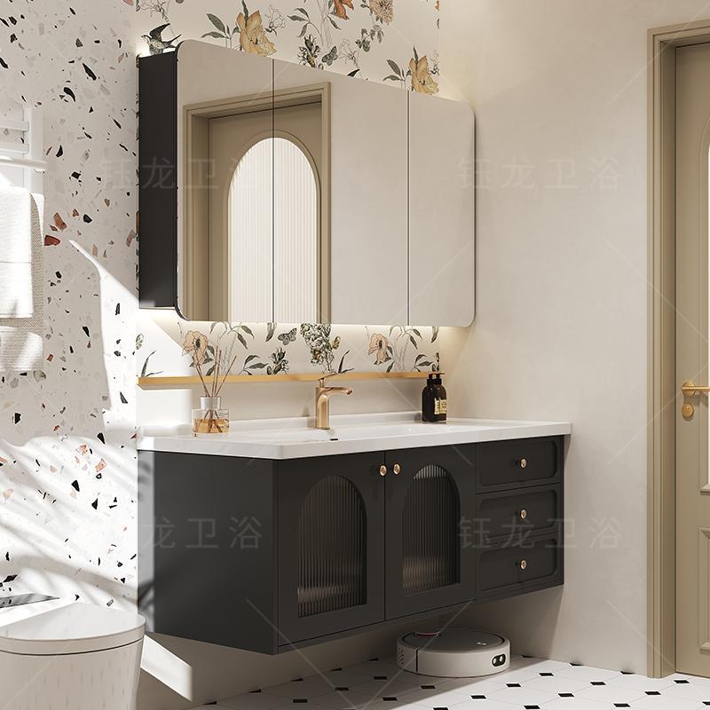 法式中古浴室柜组合洗手智能洗漱台陶瓷一体洗脸盆实木卫生间套装