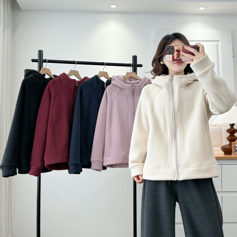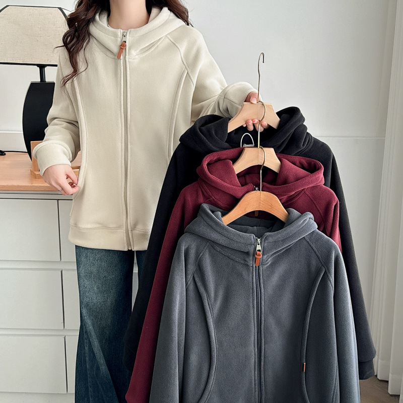 大码女装简约纯色颗粒绒连帽外套冬季宽松显瘦洋气拉链开衫PH1060
