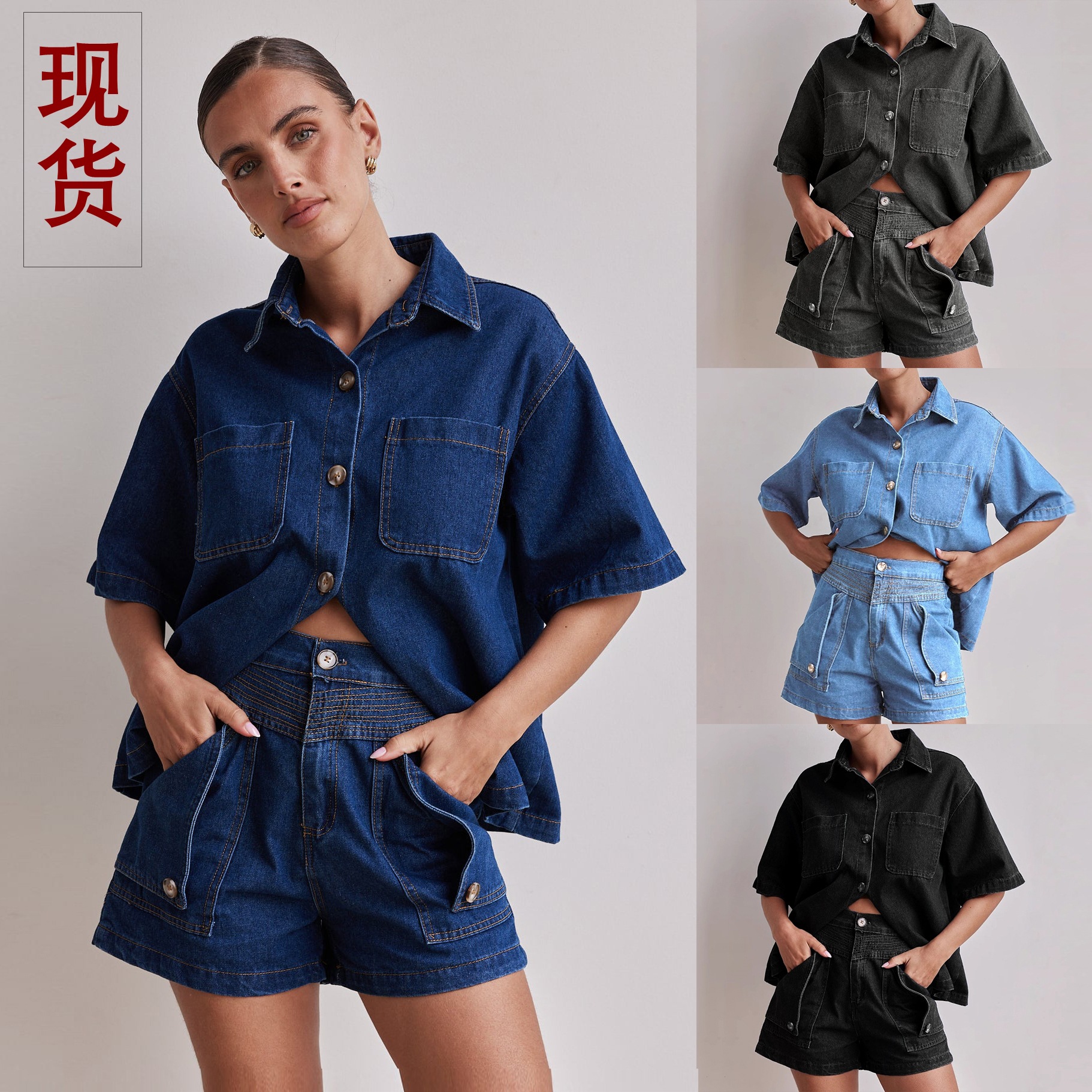 アマゾン対外貿易クロスボーダー2025夏欧米女装カジュアルレトロゆるいシャツデニムショートパンツセット