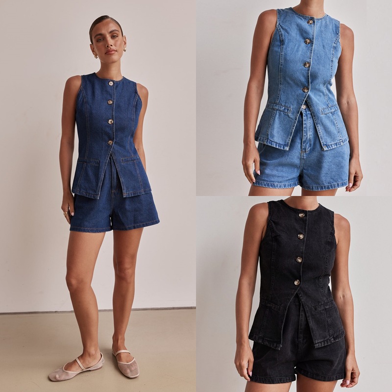 跨境TIMU外贸热销欧美潮流牛仔无袖上衣短裤套装现货代发批发套装