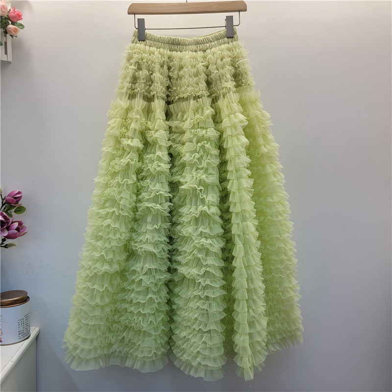 2025夏の新型カラーの甘い減齢のしわの純色の網の紗の中で長いタイプの蓬蓬のスカートのケーキのスカートの女性