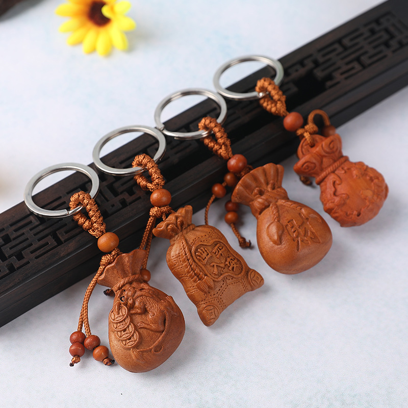 桃の木のキーホルダー、車のキーリング、木製の手彫り貔貅のペンダント、小さなバッグの飾り、民族風のアクセサリー
