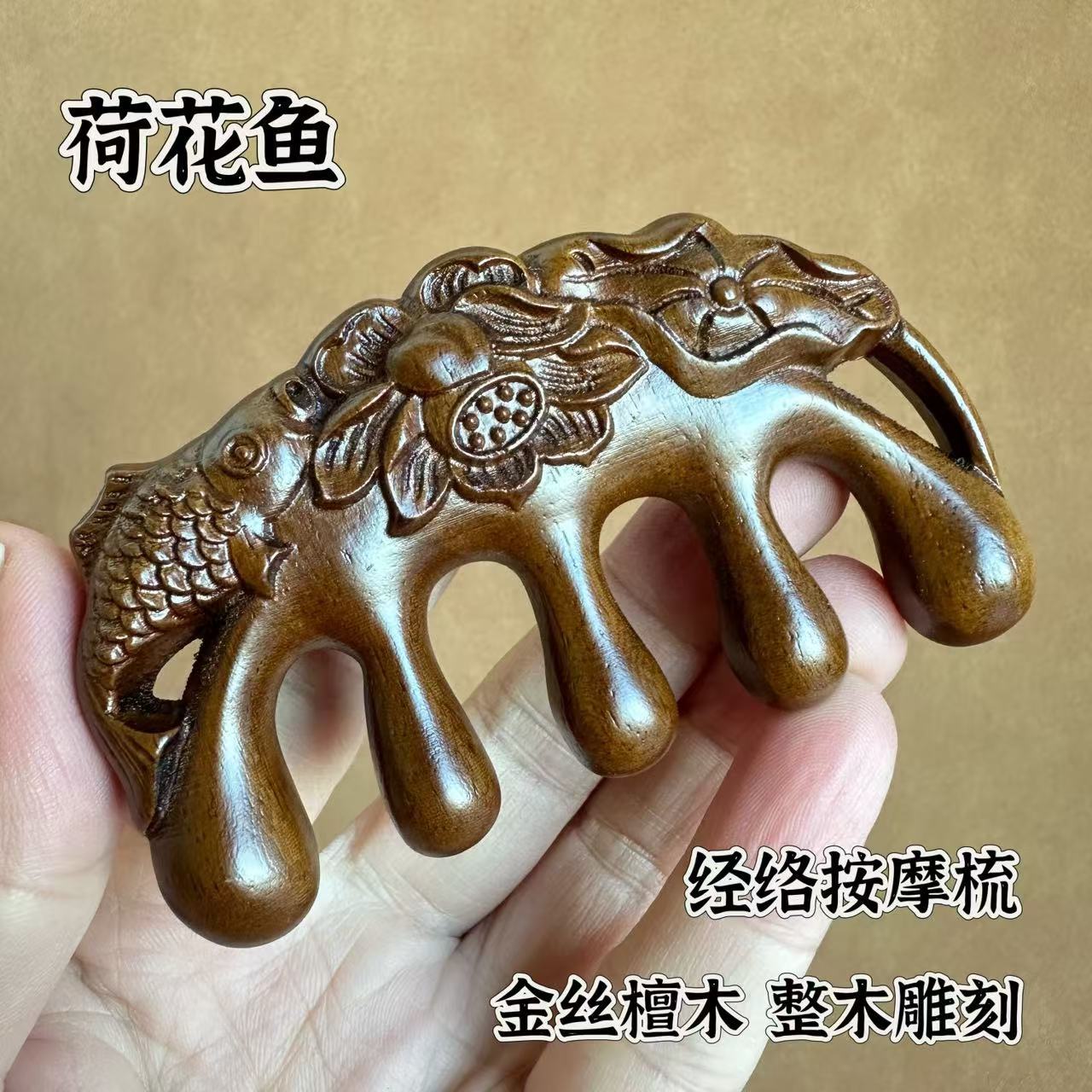 新品金糸檀ハスの花魚櫛大歯檀木櫛マッサージ木質経絡櫛緑檀頭部マッサージ櫛卸売り