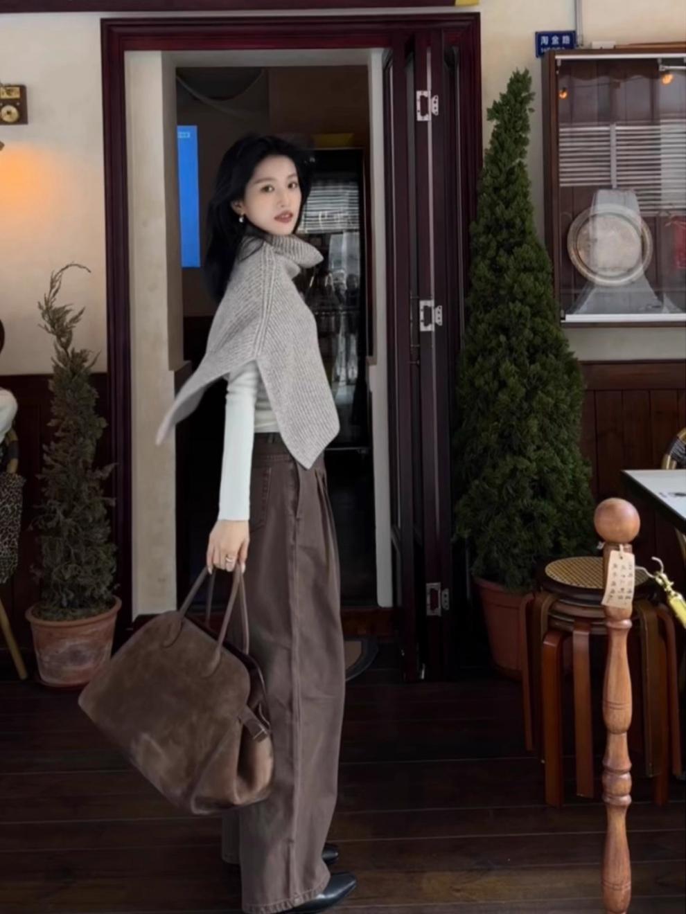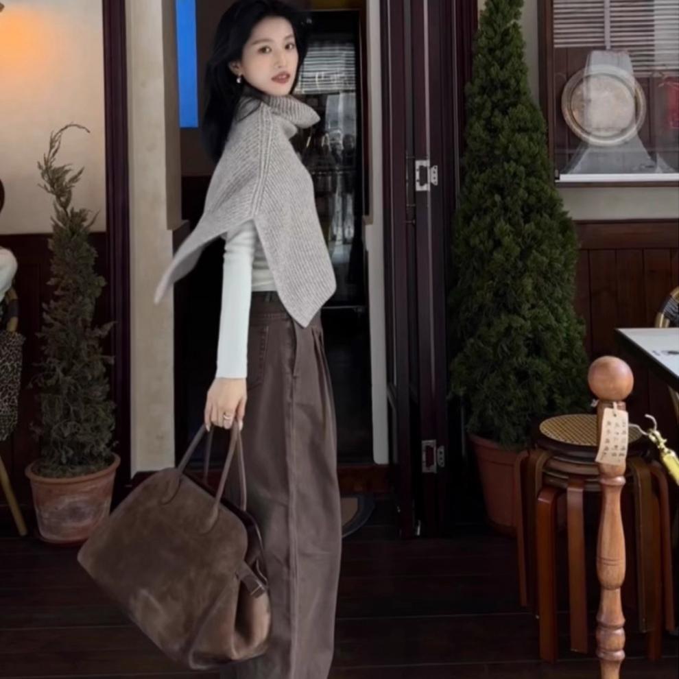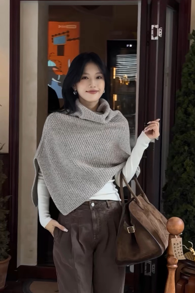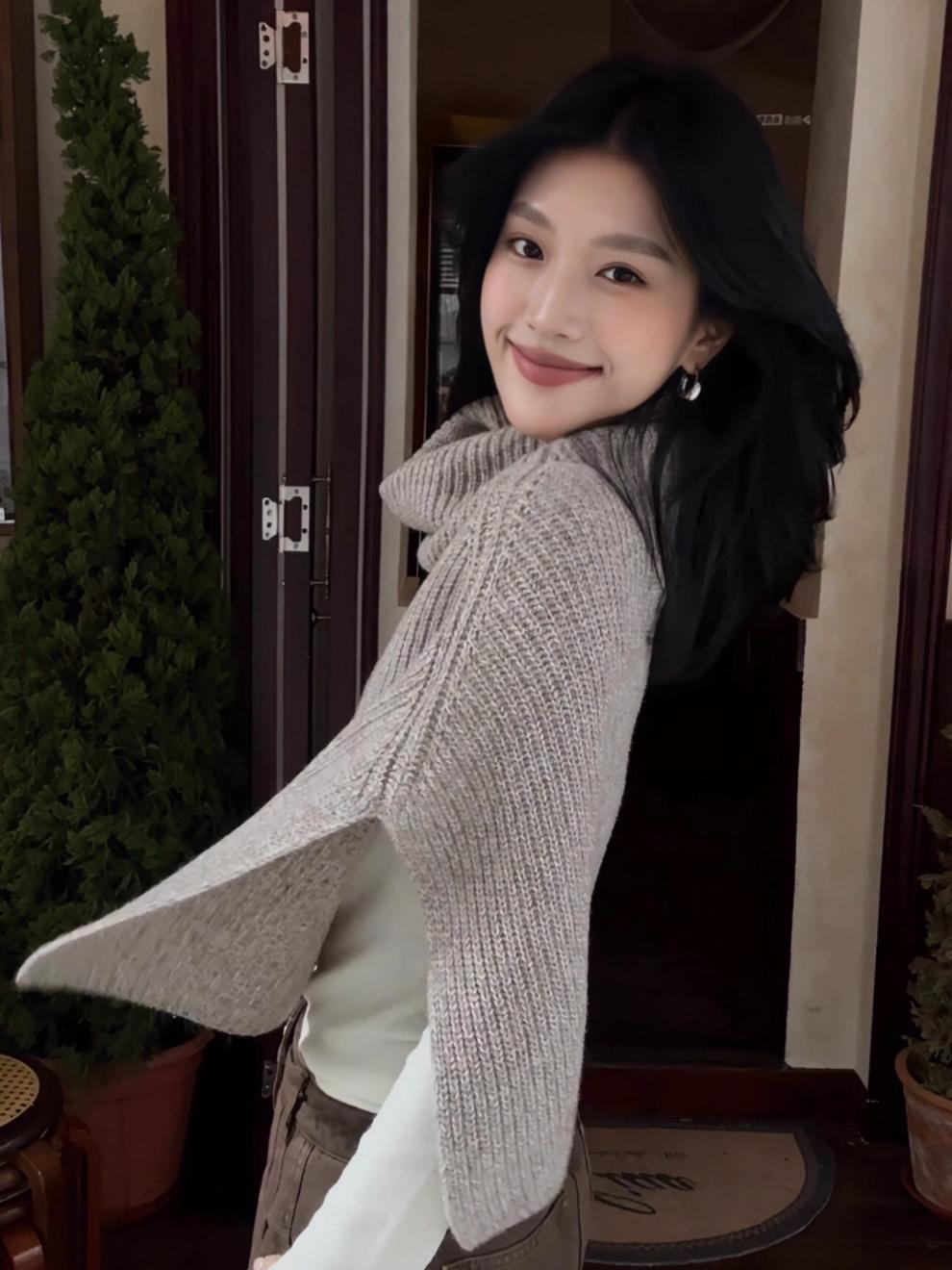秋冬毛衣披肩”杏色慵懒风气质叠穿羊毛针织衫套头上衣女
