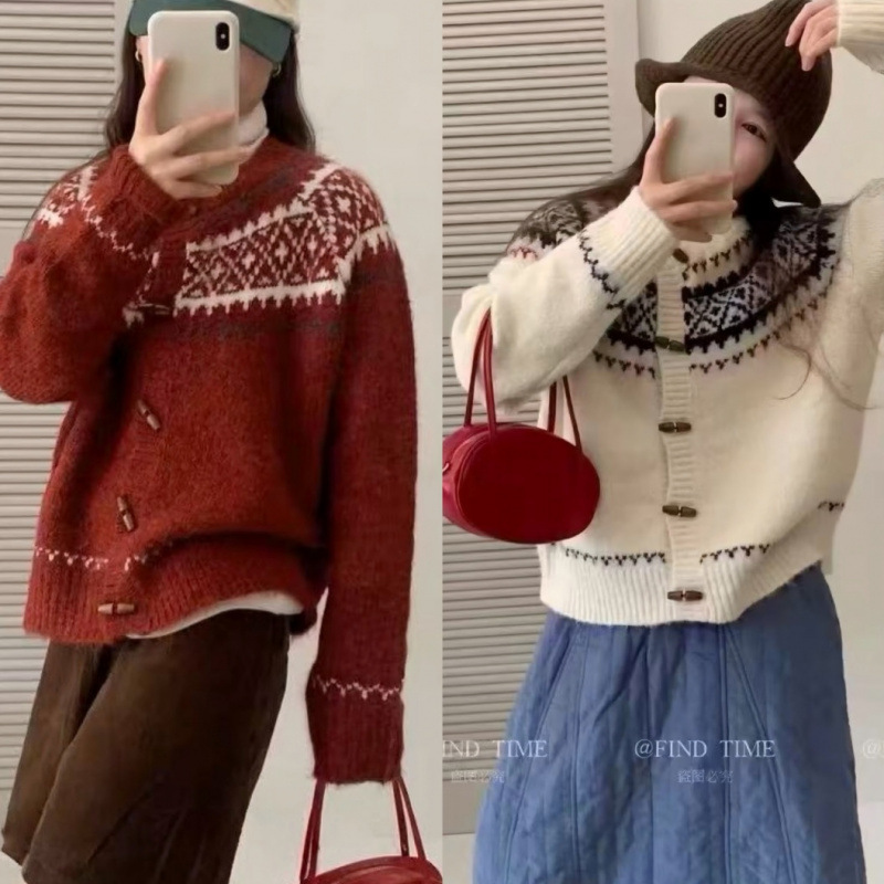 韩国东大门复古费尔岛提花氛围感木质扣羊驼毛软糯宽松慵懒风