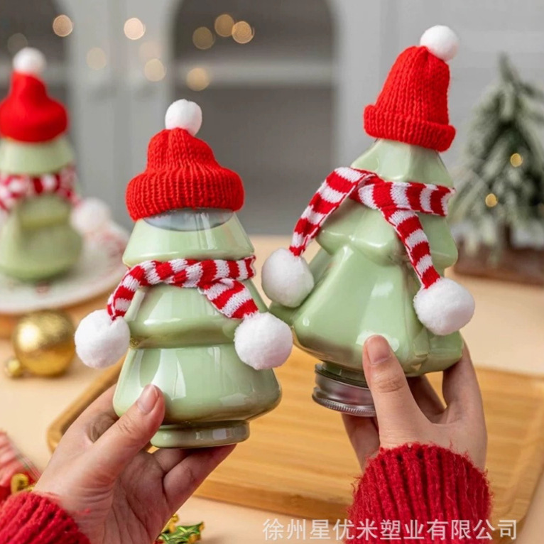 500ml圣诞树奶茶杯圣诞节糖果罐装饰瓶酸奶太妃糖包装盒饮料瓶