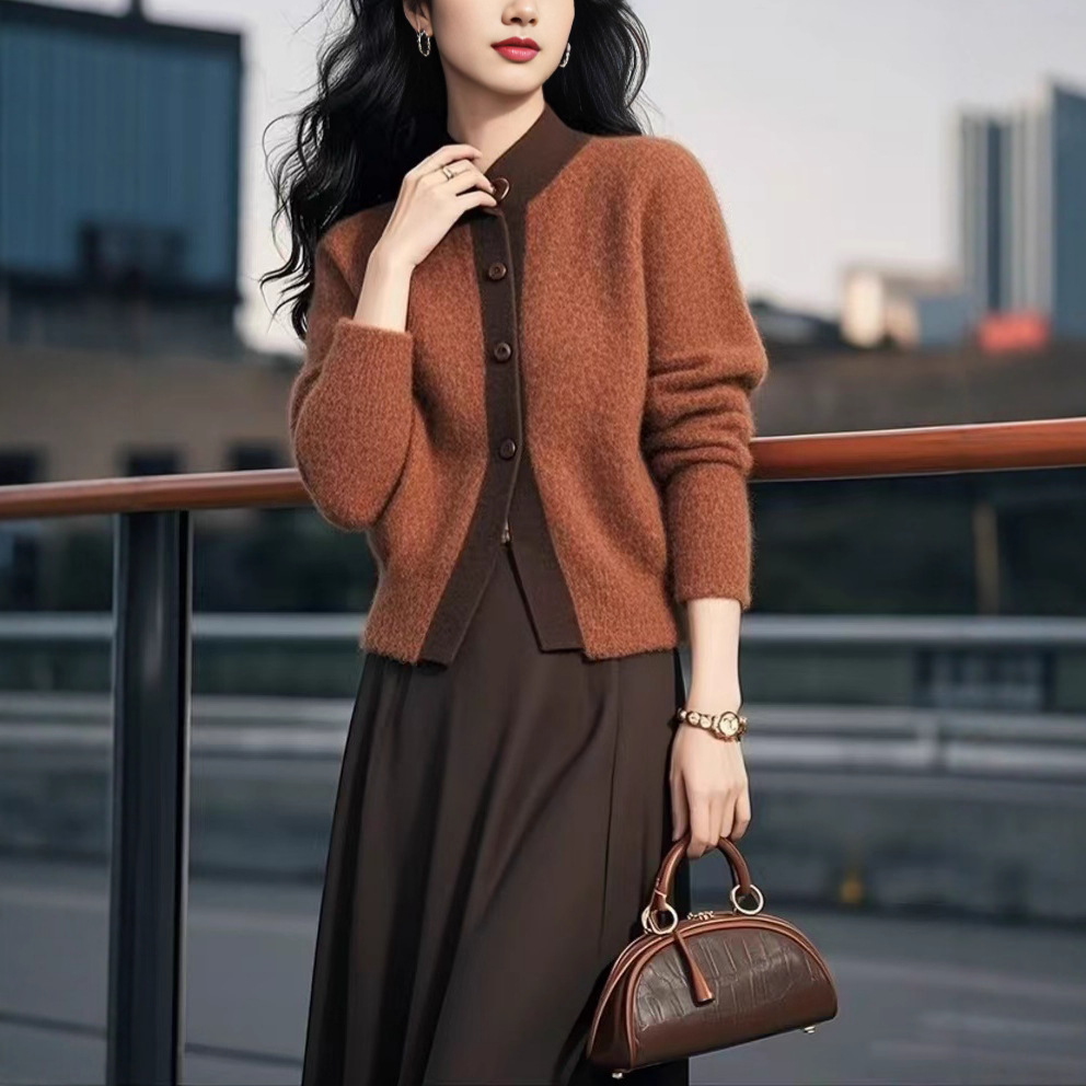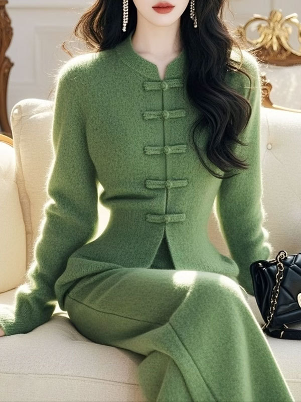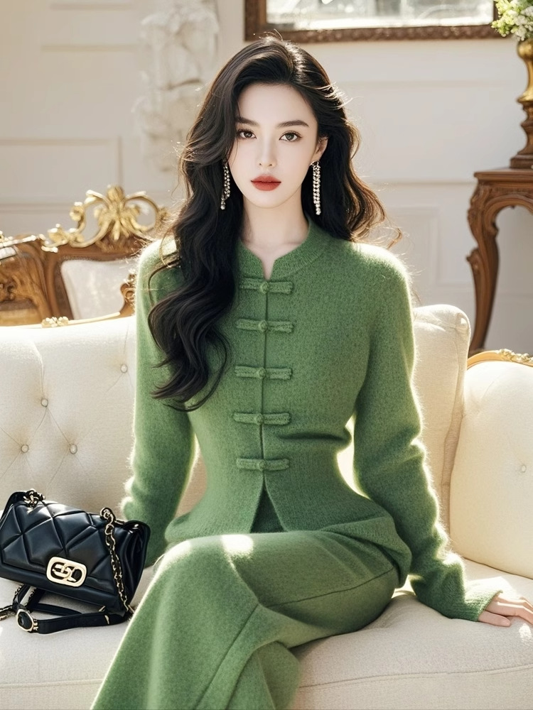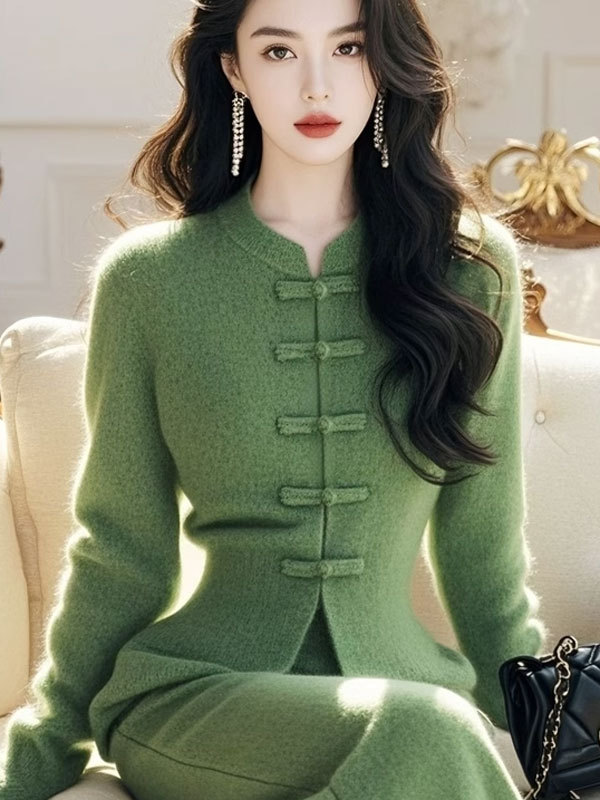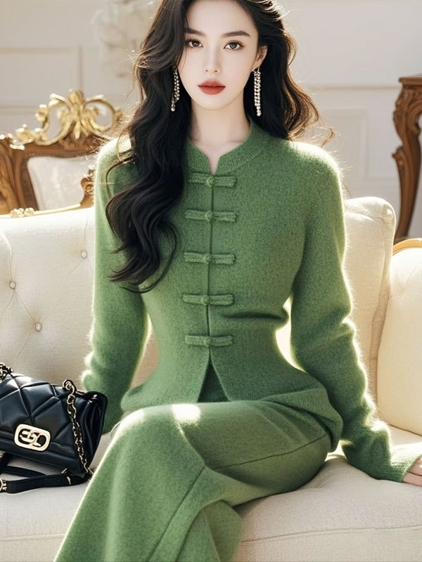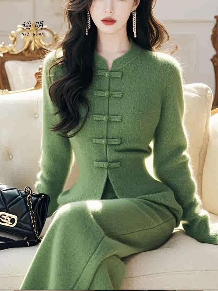 2025秋冬季穿搭一整套高级感小香风新中式国风盘扣毛衣裤子套装女