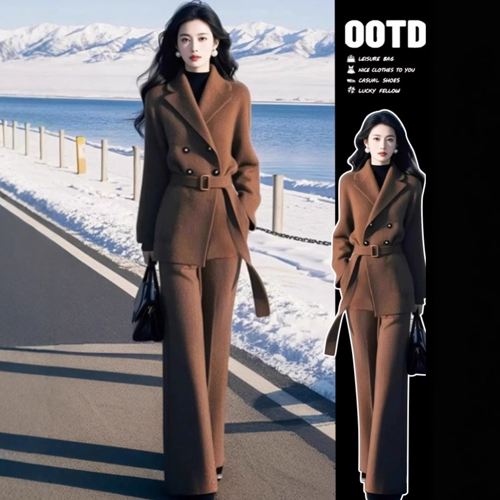 高端网红爆款毛呢西服套装女2025冬季款气质通勤显瘦外套+阔腿裤