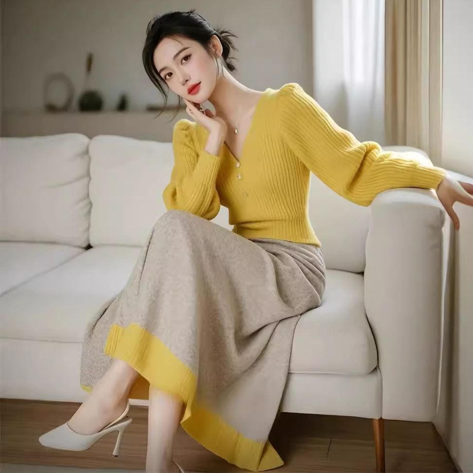 早秋の新型黄色の小香風長袖vネックの底のメリヤスの香港風の復古の独特なセットのスカートの女性