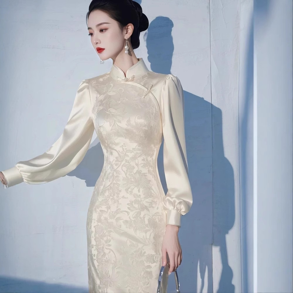 新中国式高級感純色立長袖ワンピース女性春秋デザイン感が腰を収めて痩せている独特の絶美スカート