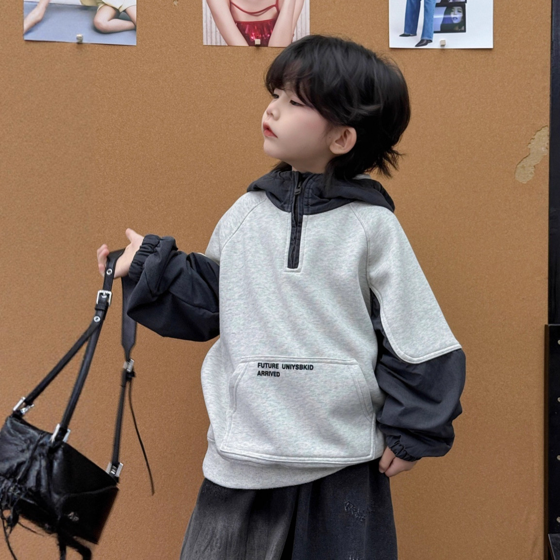 2025年新款男童连帽卫衣冬季上衣潮酷帽衫男孩洋气帅气户外拼接