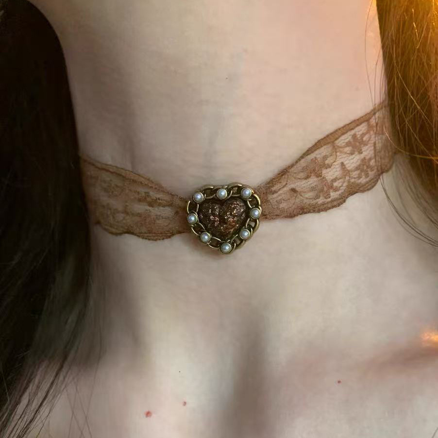 咖色蕾丝中古choker颈链女复古珍珠爱心吊坠锁骨链日常百搭项圈