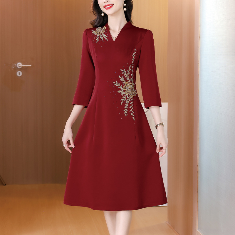 喜姑は大きい赤色の刺繍のチャイナドレスのドレスのスカートの2024春夏の新型のお母さんの服の気質の優雅なワンピースを詰めます。