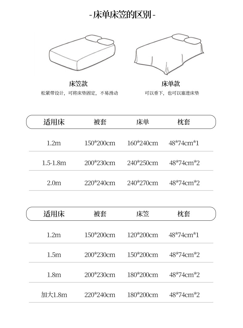 尺寸规格 1.2m床单款三件套,1.5m床单款四件套,1.8m床单款四件套,2.0m床单款四件套,1.5m床笠款四件套,1.8m床笠款四件套,1.8m加大被套床笠款四件套