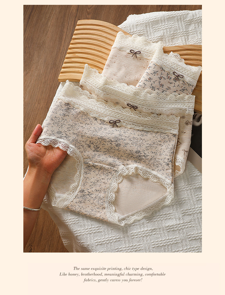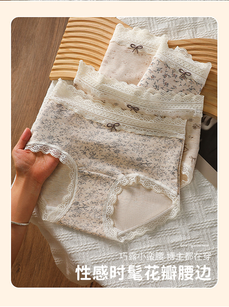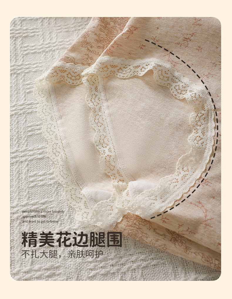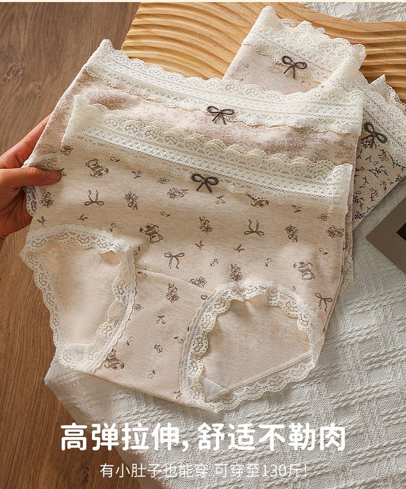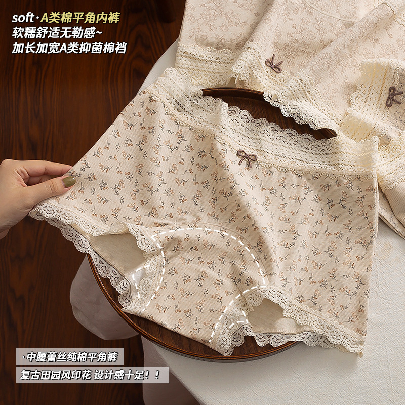 防走光大码200斤内裤女田园印花蕾丝腰头裤脚花边60支彩棉四角裤