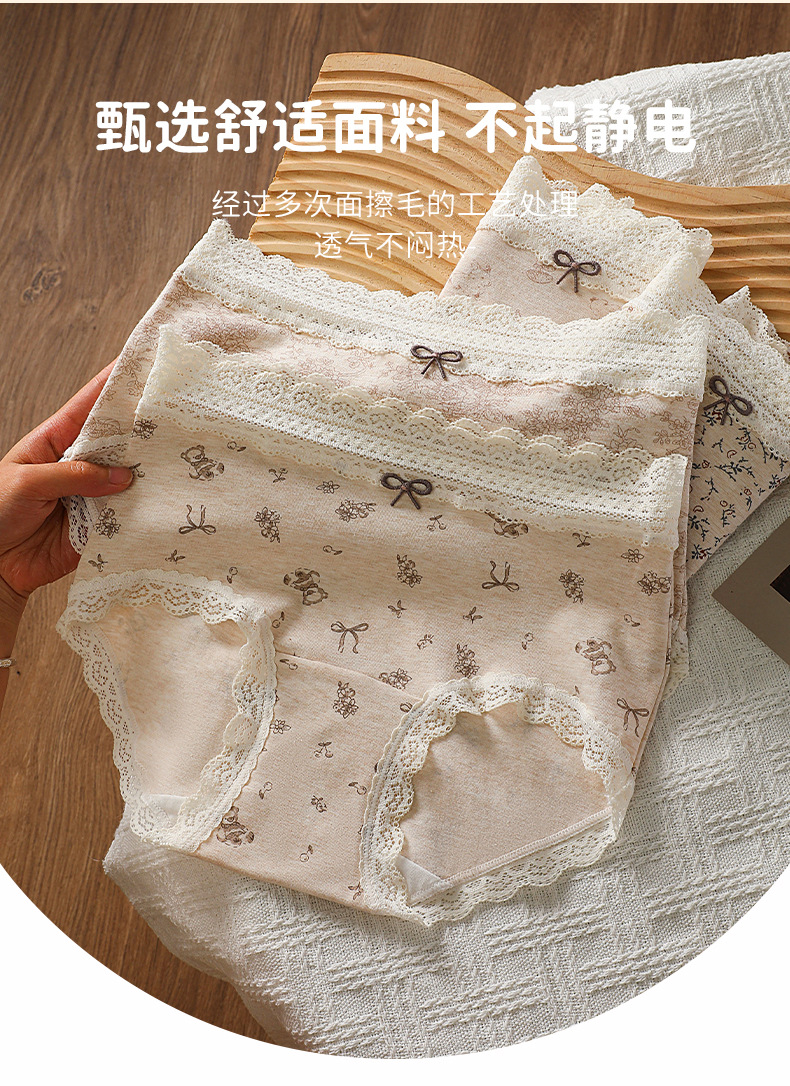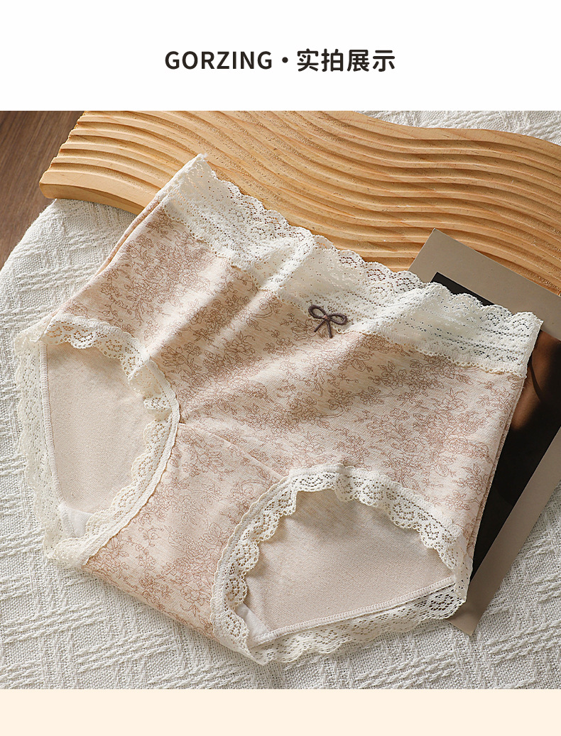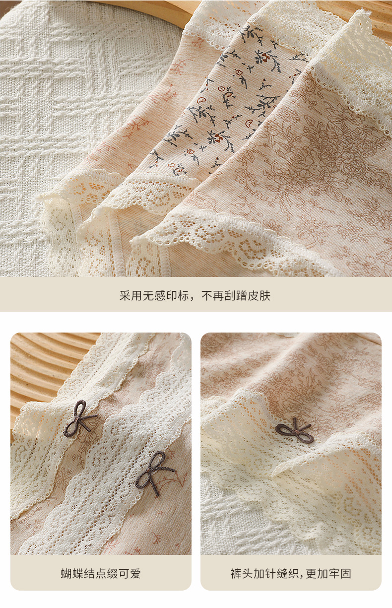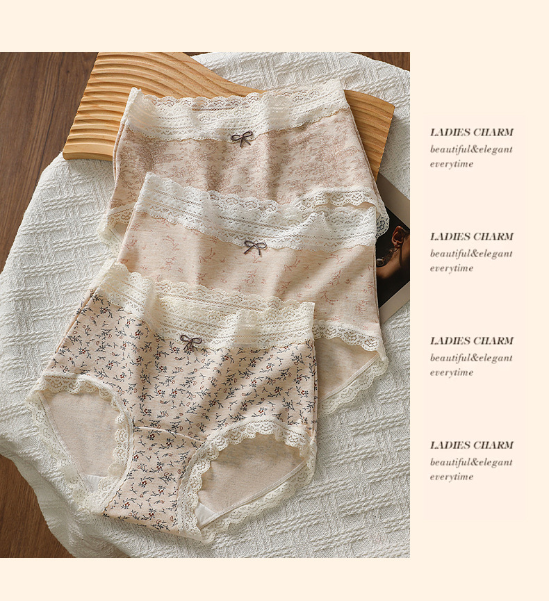 防走光大码200斤内裤女田园印花蕾丝腰头裤脚花边60支彩棉四角裤