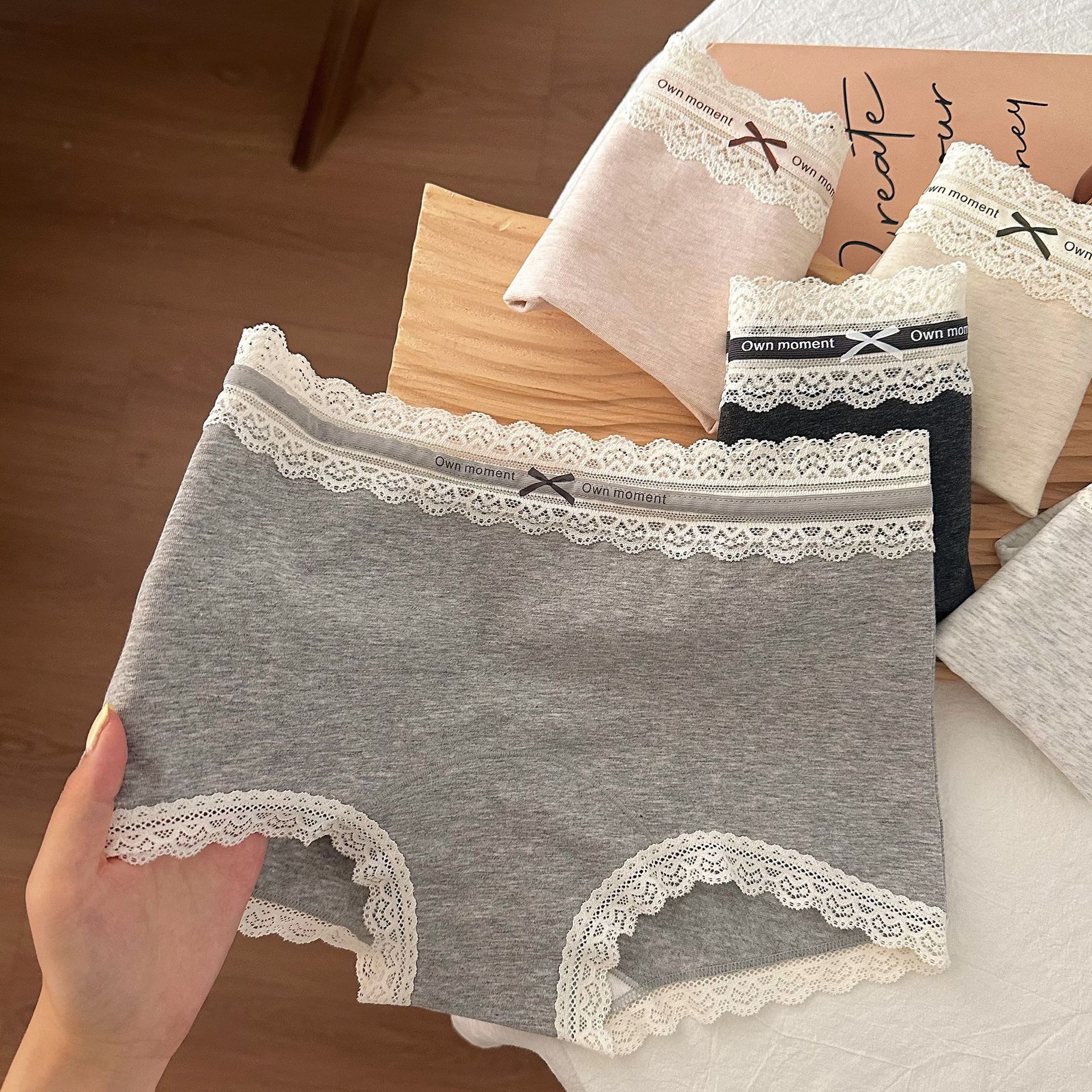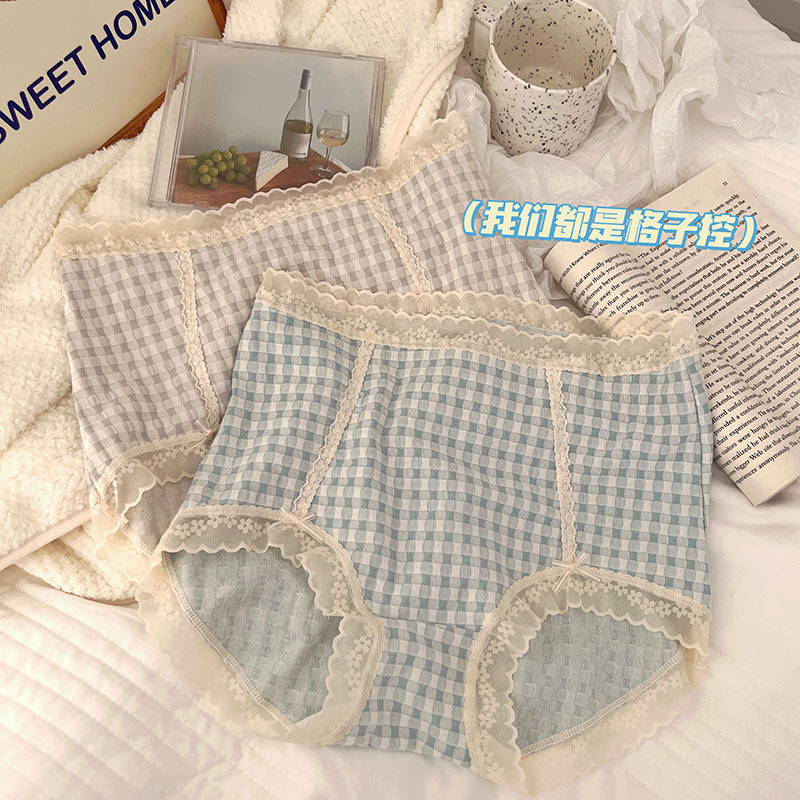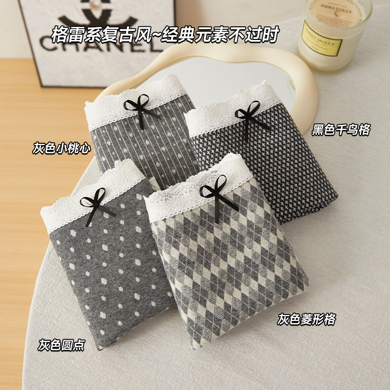 灰色系蕾丝边内裤女波点千鸟格中腰大码加长裆磨毛女士平角裤胖MM
