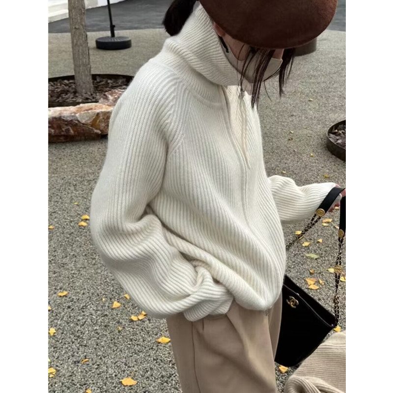 重いポンドの厚いウールのセーターの女性の毛の高い襟のファスナーのセーターのカーディガンの怠惰でゆったりしている麻の花のニットの上着のコート