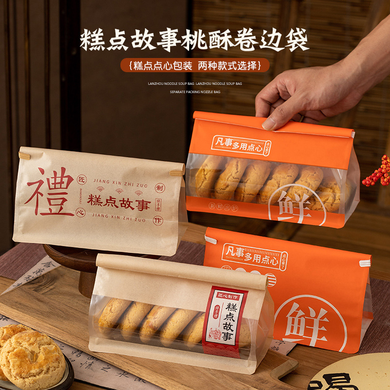 国风牛皮纸面包袋棉纸卷边封西点烘焙包装袋饼干袋可印logo密封袋