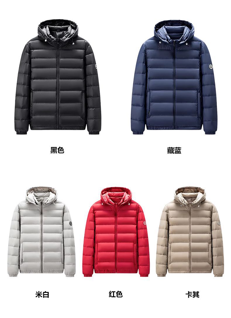 越境人気商品、在庫安定、ホワイトダックダウン使用、メンズスタンドカラー軽量保温ダウンジャケット、2025年冬新作、団体注文受付中