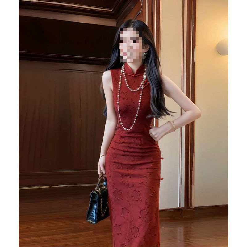 新しい中国風の赤いノースリーブチャイナドレス婦人服 2025 夏の新しい国民風セクシーなウエストロングスカート