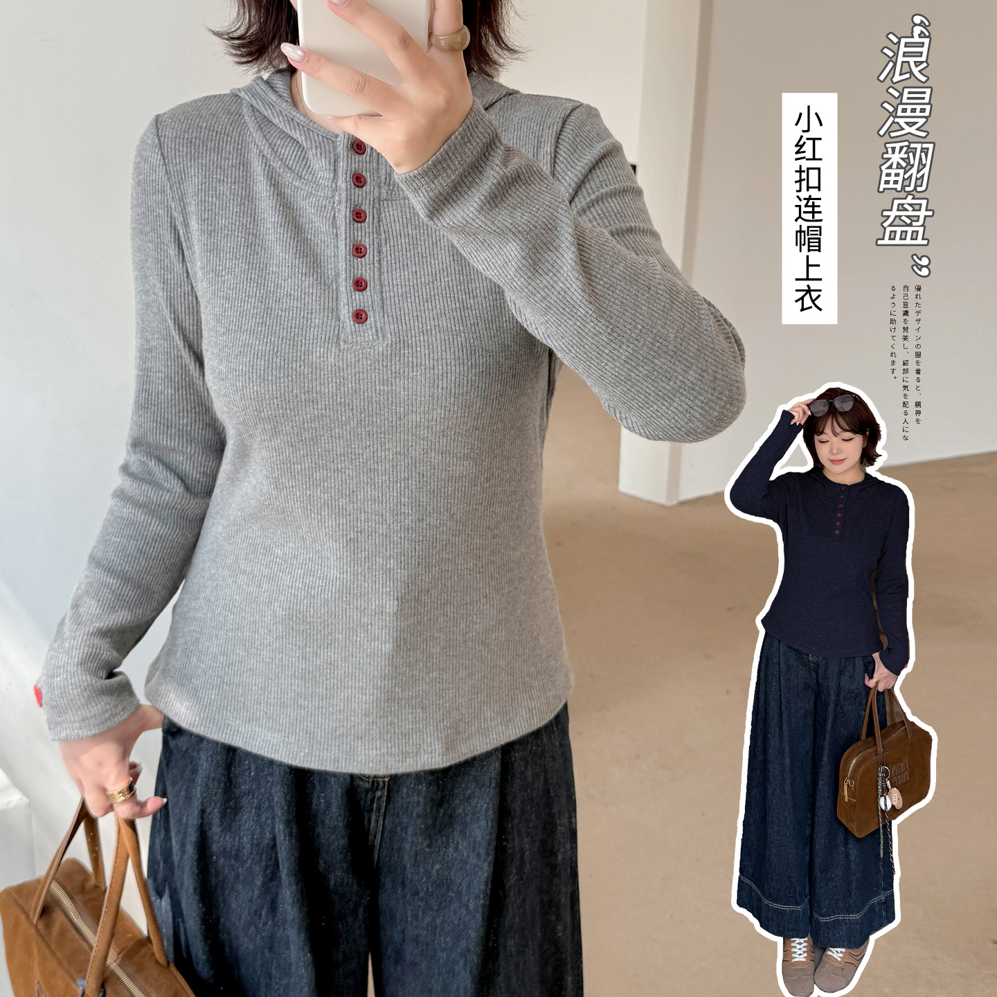 伊诺大码女装小红扣撞色上衣2025秋季新款套头连帽长袖T恤413509