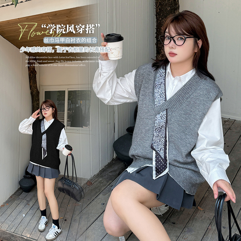 伊诺大码女装V领丝巾针织马甲套装2025秋纯色衬衣两件套313069T21