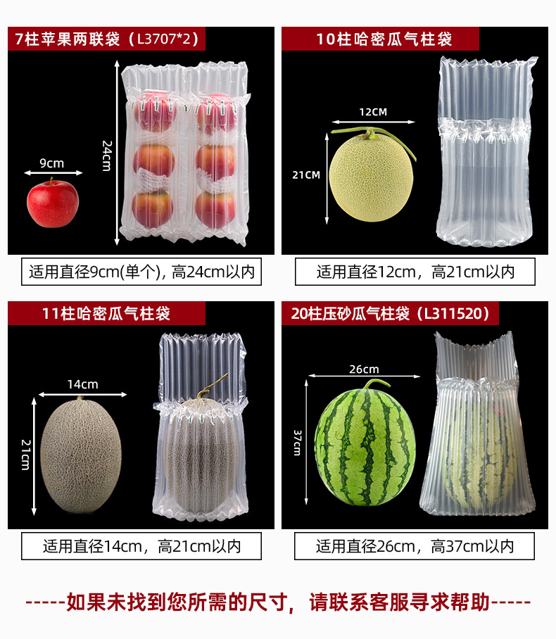 规格型号 20柱(适合直径26cm*37cm高)麒麟西瓜;PE+PA共挤膜;8丝,11柱(适合直径14cm*21cm高)哈密瓜;PE+PA共挤膜;5丝,10柱(适合直径12cm*21cm高)哈密瓜;PE+PA共挤膜;5丝,7柱(适合直径9cm*24cm高)苹果;PE+PA共挤膜;5丝