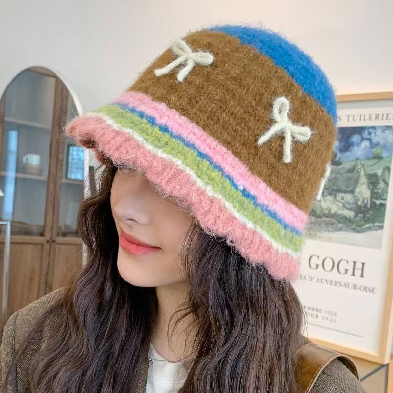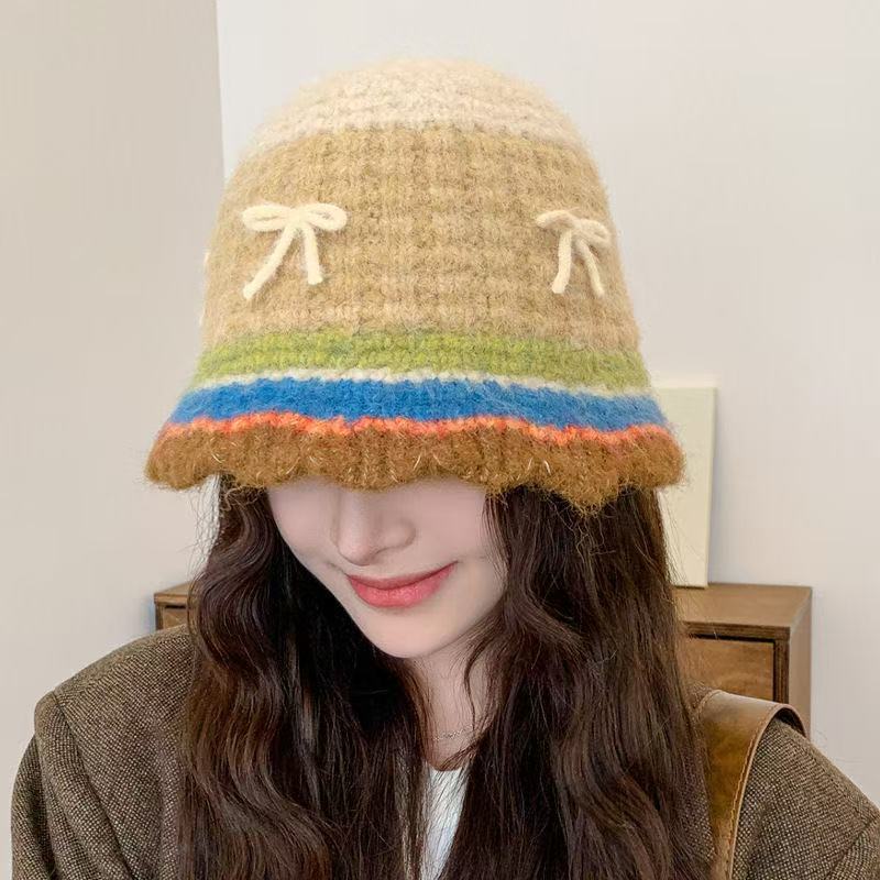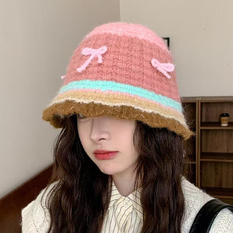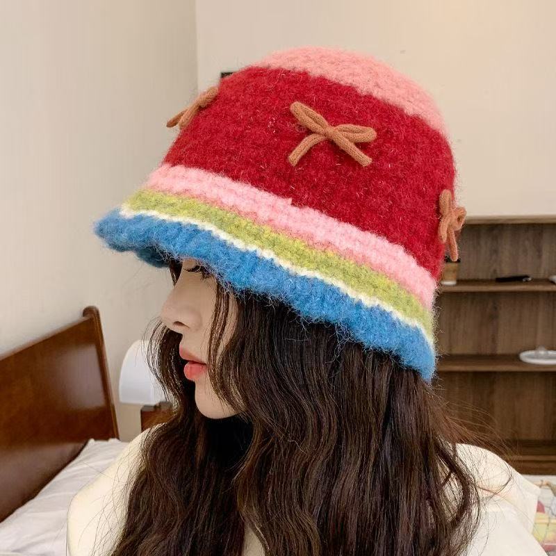 韩版撞色条纹针织帽女甜美可爱蝴蝶结毛线帽子秋冬毛绒保暖水桶帽