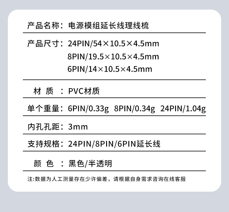 颜色 24pin主板线梳【黑色】4个装,6pin显卡线梳【黑色】8个装,8pin显卡线梳【黑色】12个装,6/8/24pin组合【黑色】24个装,24pin主板线梳【透明白】4个装,6pin显卡线梳【透明白】8个装,8pin显卡线梳【透明白】12个装,6/8/24pin组合【透明白】24个装
