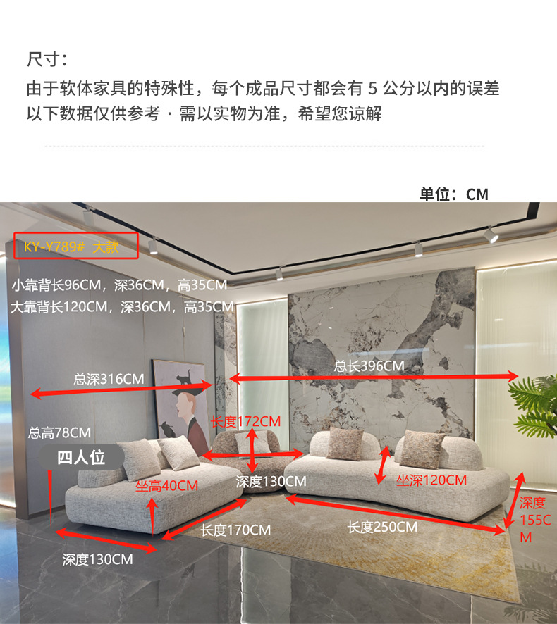 尺寸 右位单-90*105*43/76,左双位-130*140*43/76,中三人位-205*101*43/76,组合沙发1-315*151/43/76,组合沙发2-396*240*43/76