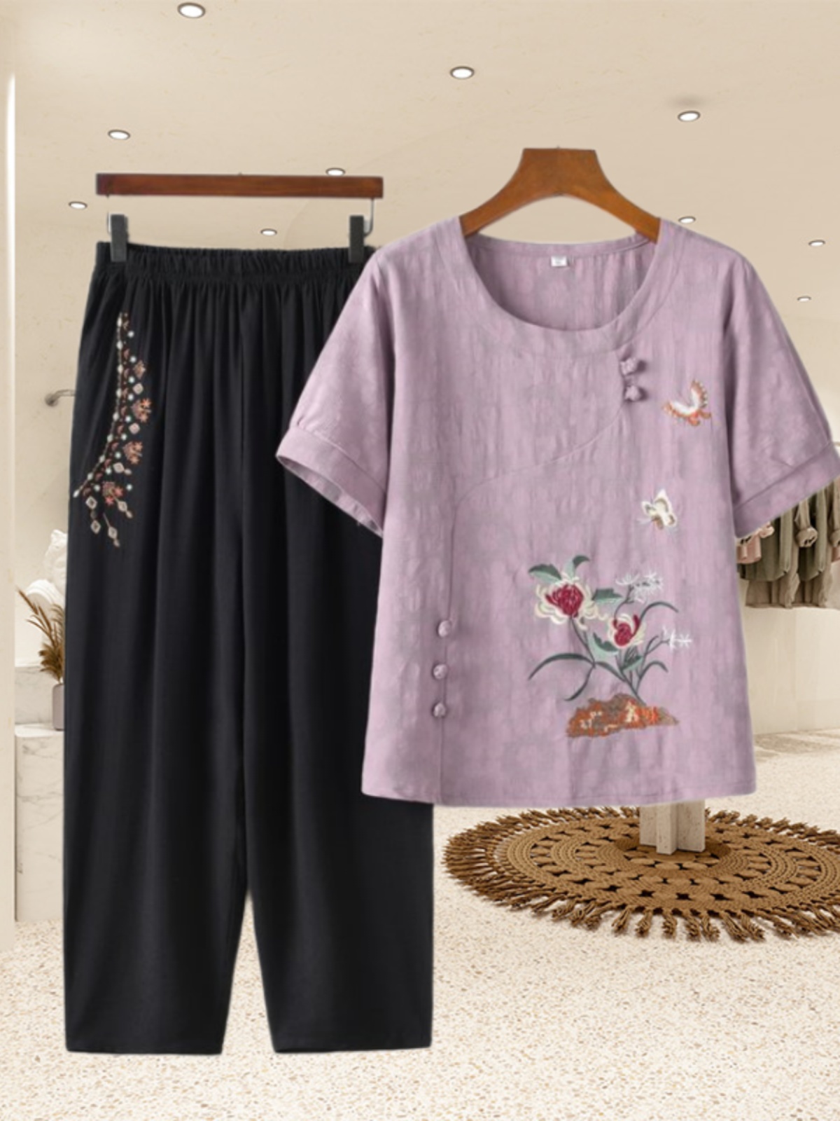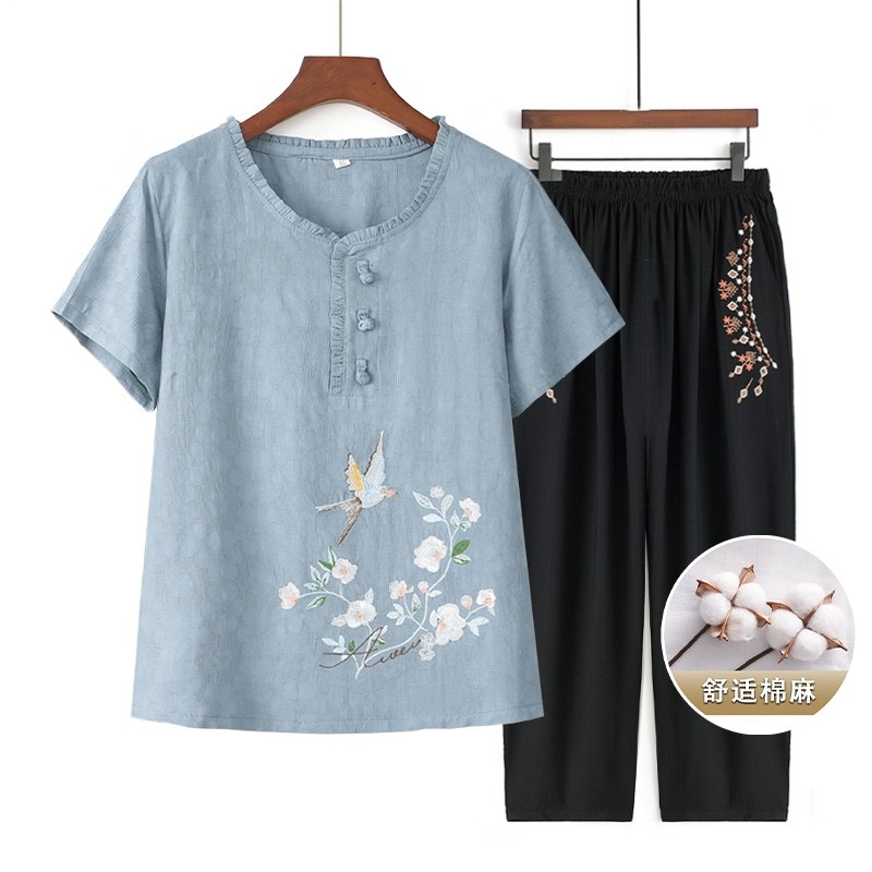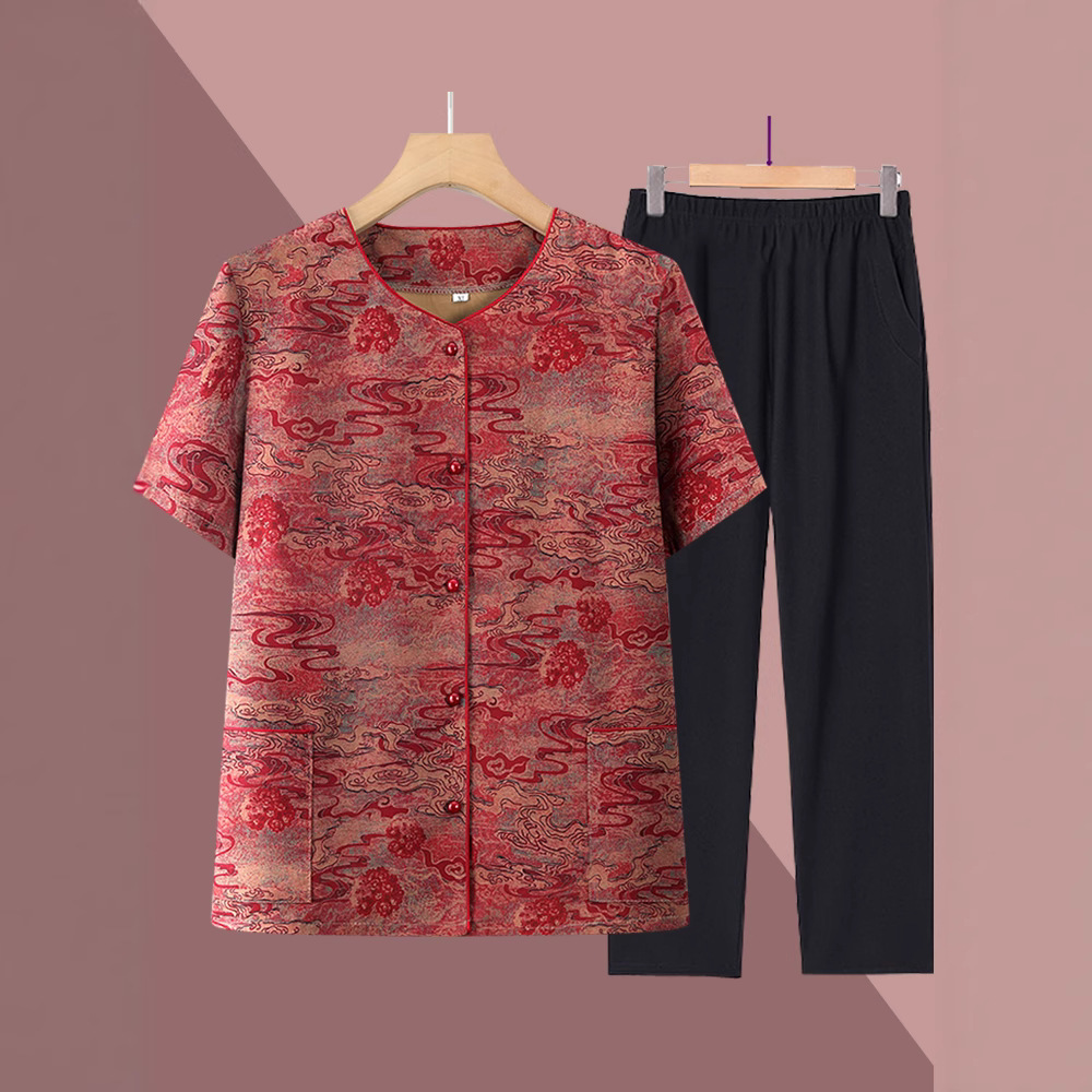 ママの夏スーツ 五分袖Tシャツ 中高年女性・おばあちゃん向け 中国風ミッドスリーブトップス 2点セット