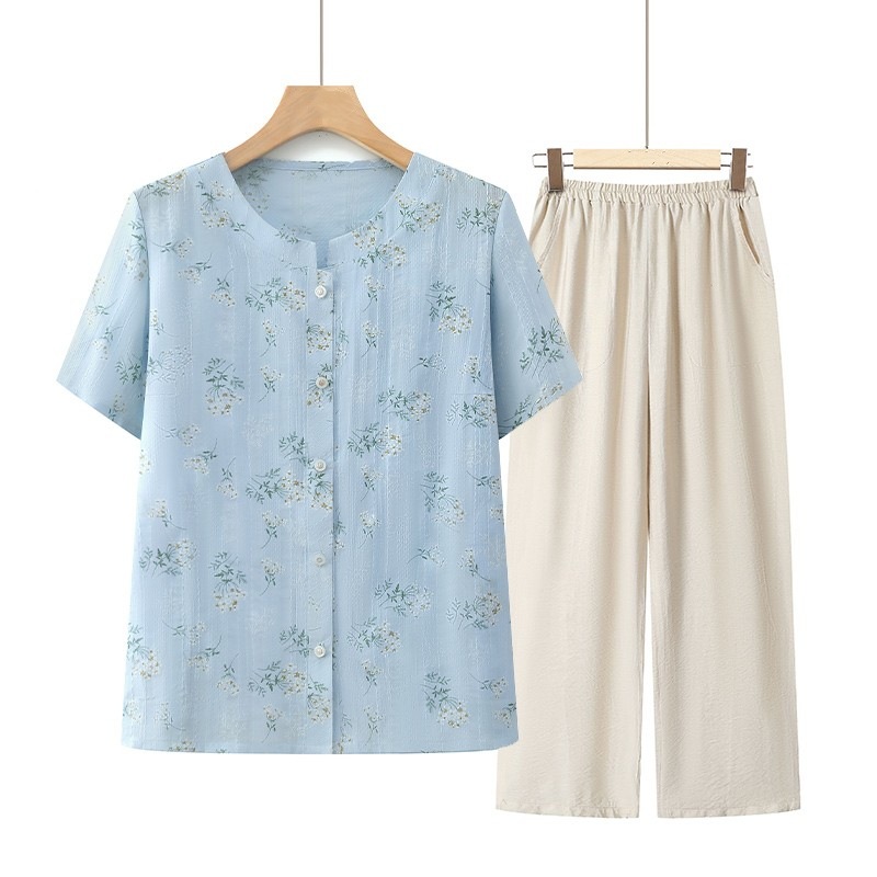 お母さんの夏服の中で高齢の婦人服のおばあさんのスーツの半袖のtシャツの2つのセットのファッションの洋風の上着の老人の小さいシャツ