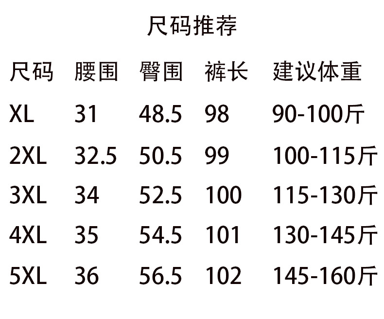 尺码 XL-- 建议90-115斤,2XL -- 建议115-125斤,3XL -- 建议125-135斤,4XL -- 建议135-150斤,5XL -- 建议150-160斤