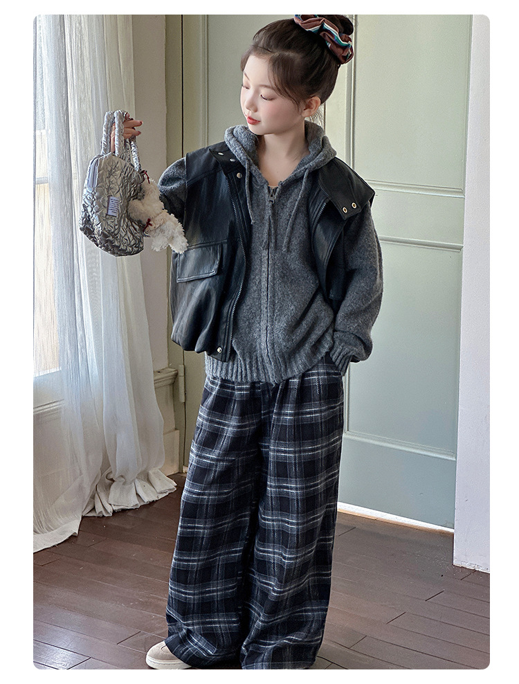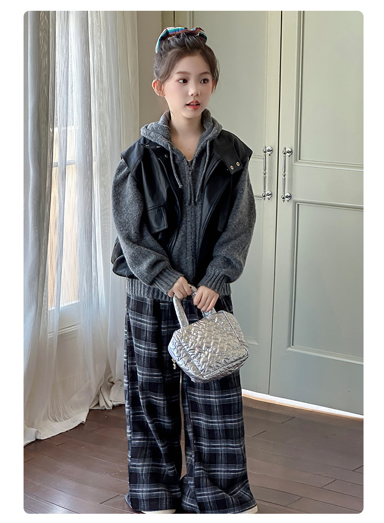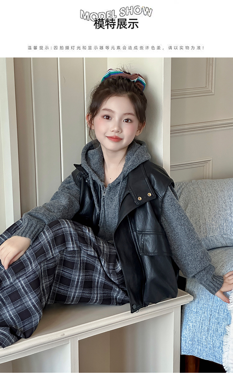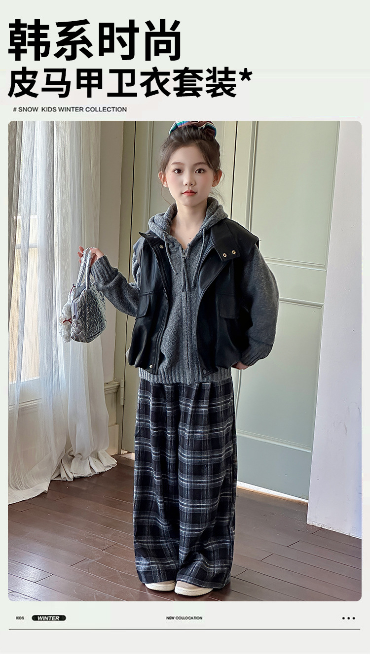 货号 CS8347灰色毛衣皮马甲格子裤三件套