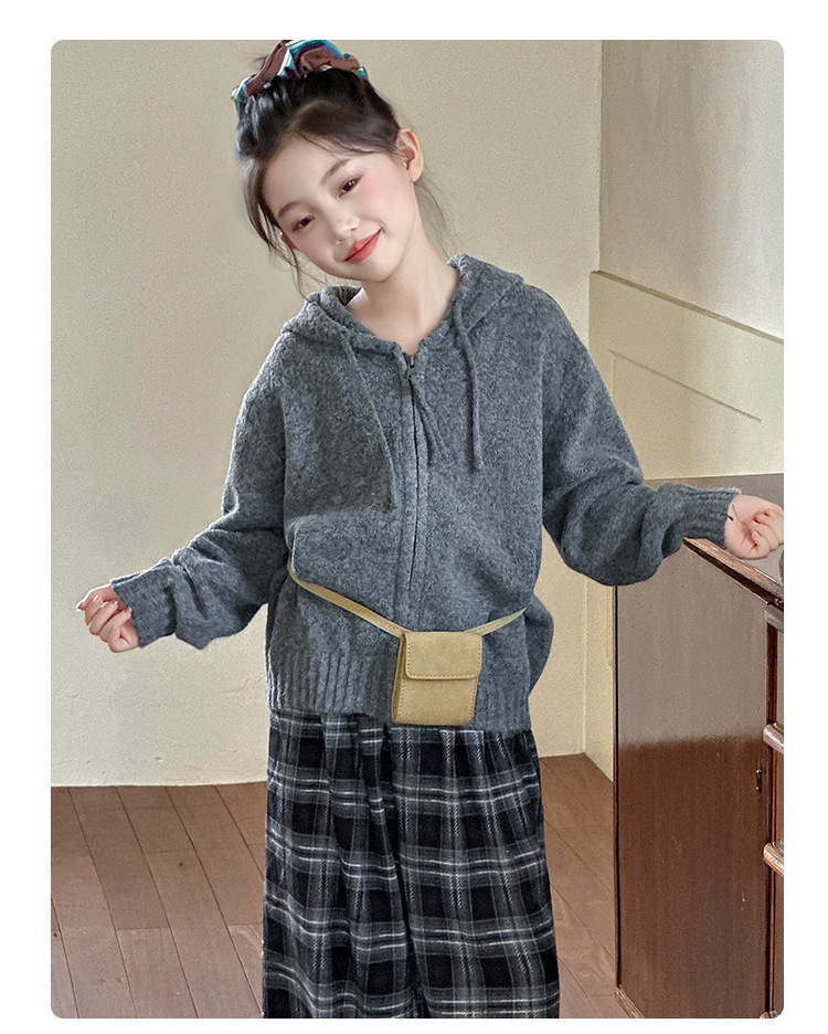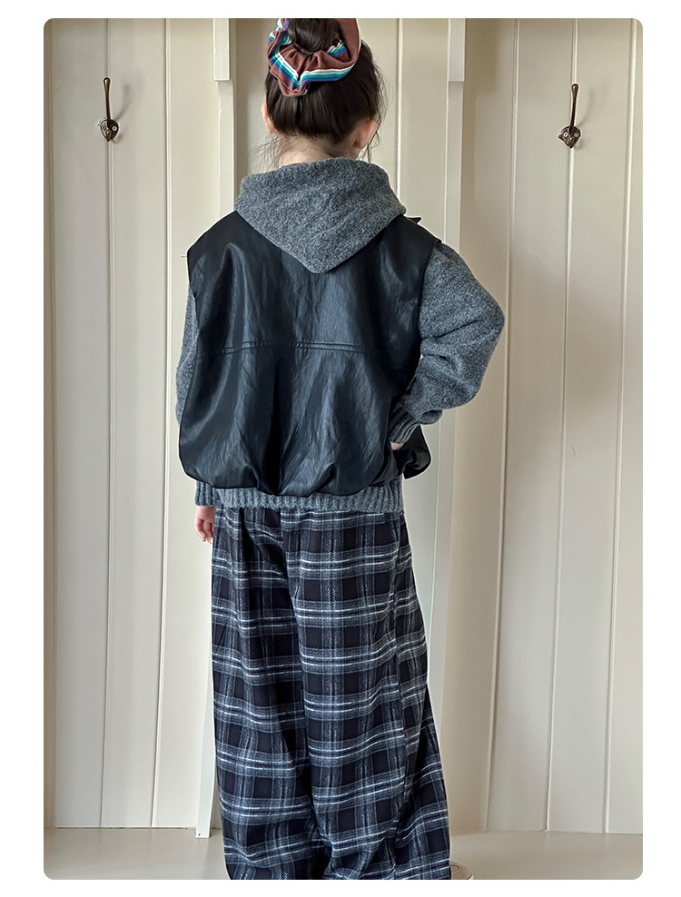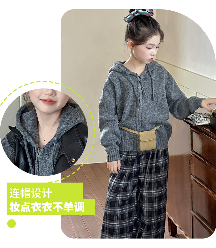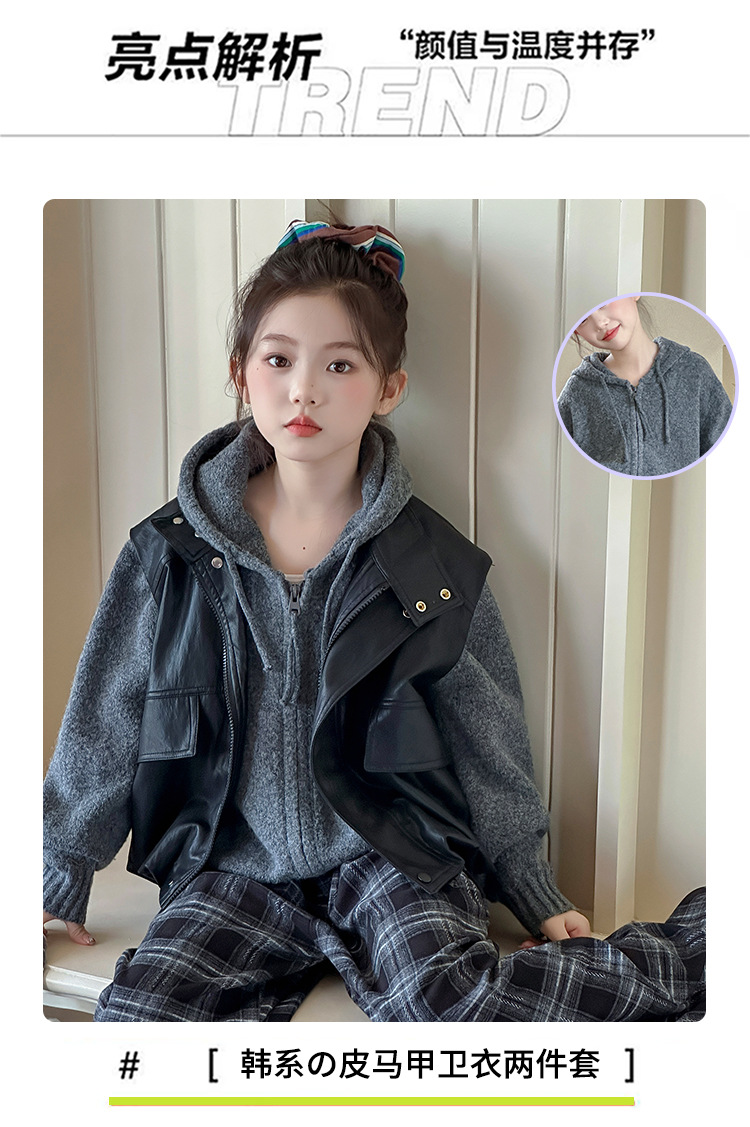 货号 CS8347灰色毛衣皮马甲格子裤三件套
