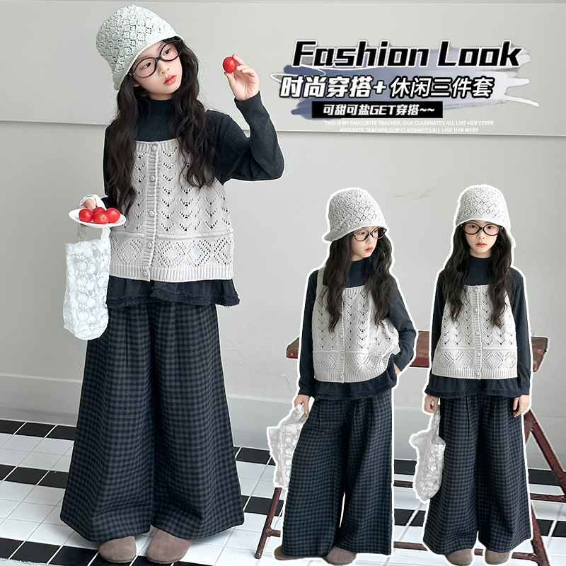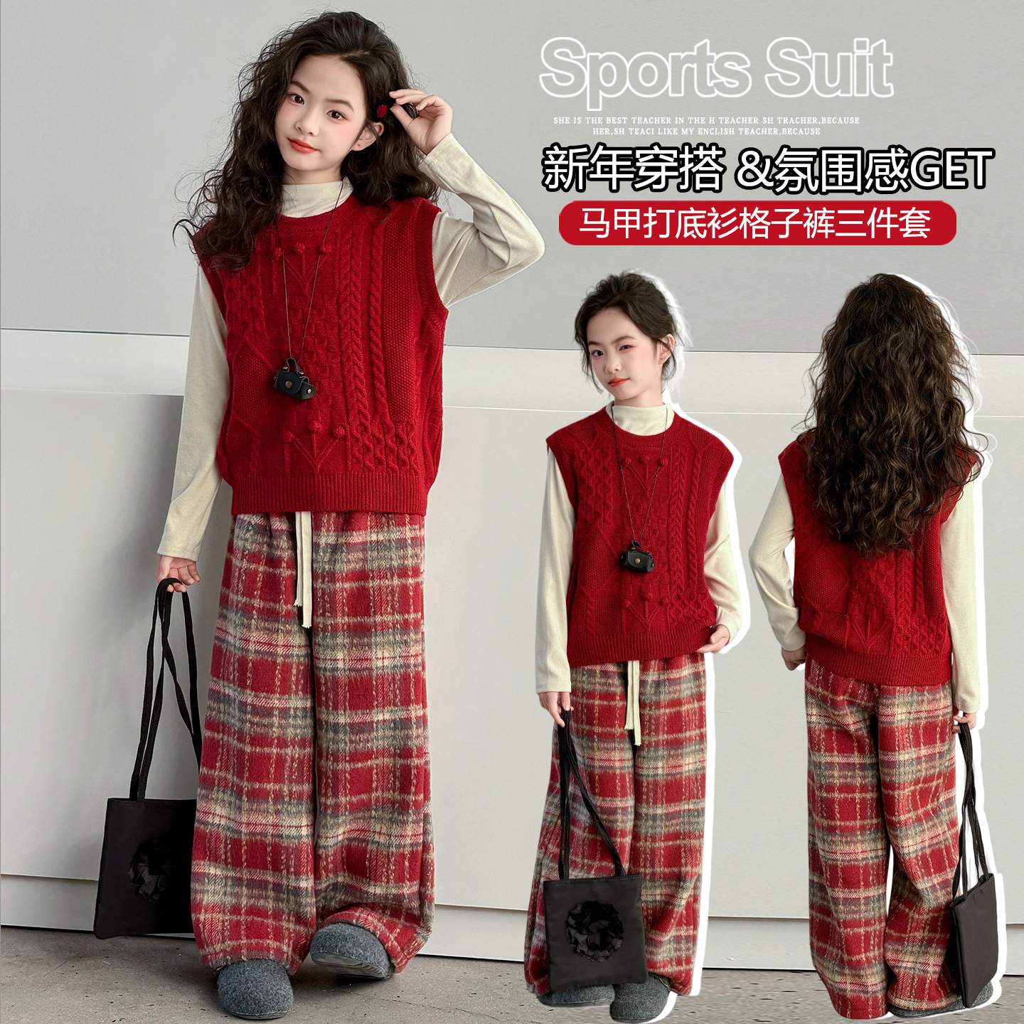2025新款女童三件套冬季加绒加厚中大童时尚毛衣马甲格子裤套装潮
