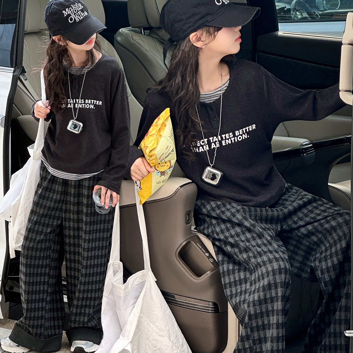 女童秋装套装2025新款洋气大童秋季休闲长袖打底衫儿童格子裤套装