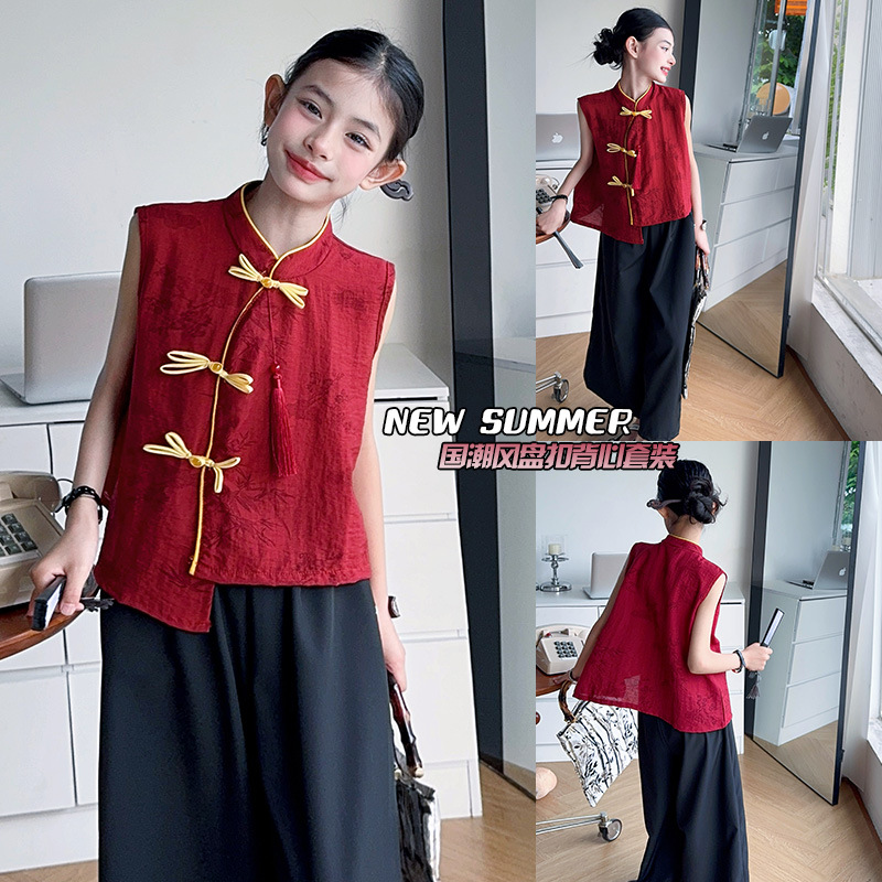 女の子中国風バックルベストセット 2025 新しい大きな子供女の子夏子供の夏服中国風古代唐スーツ