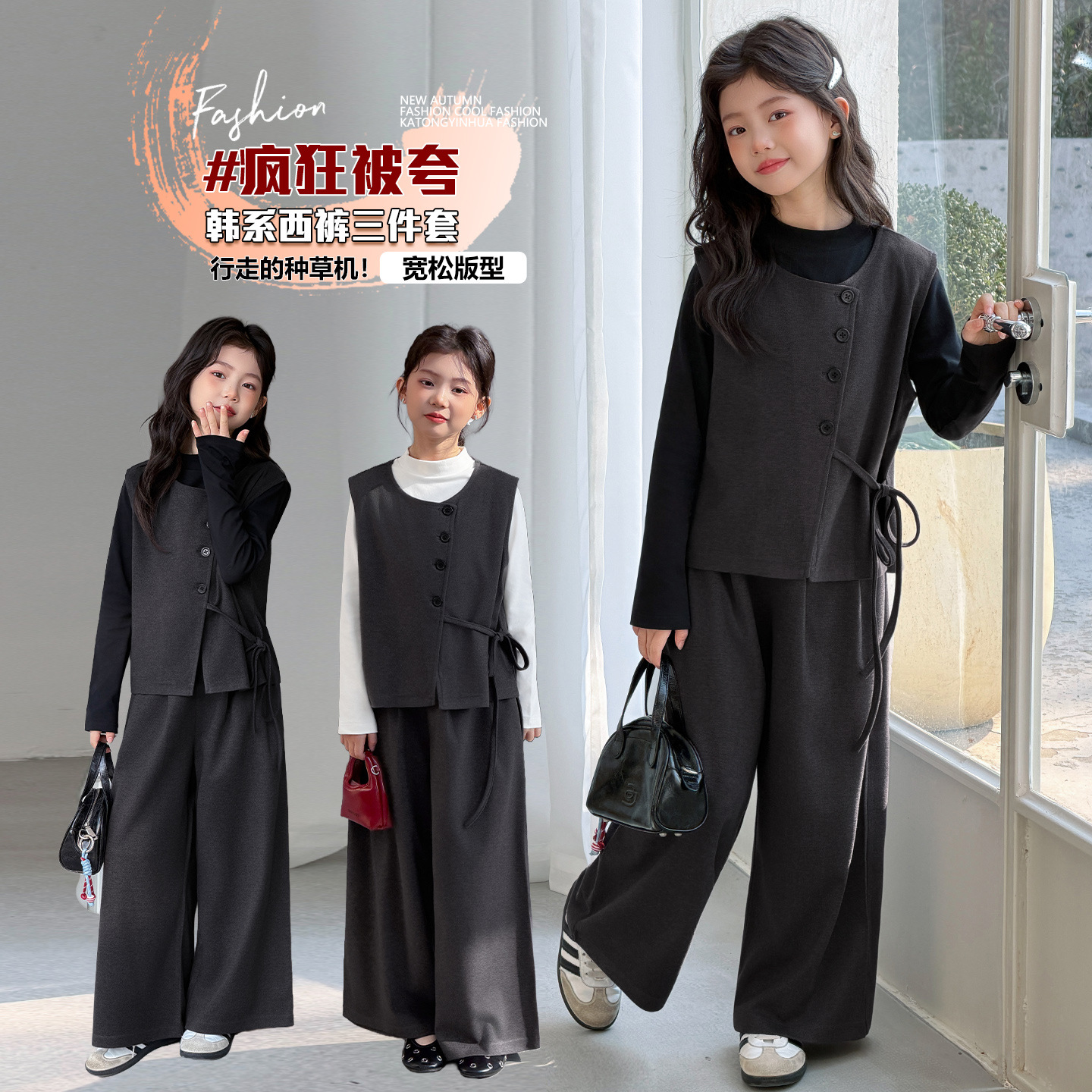 韩系女童叠穿百搭春装马甲T恤套装休闲韩系穿搭女大童春秋三件套