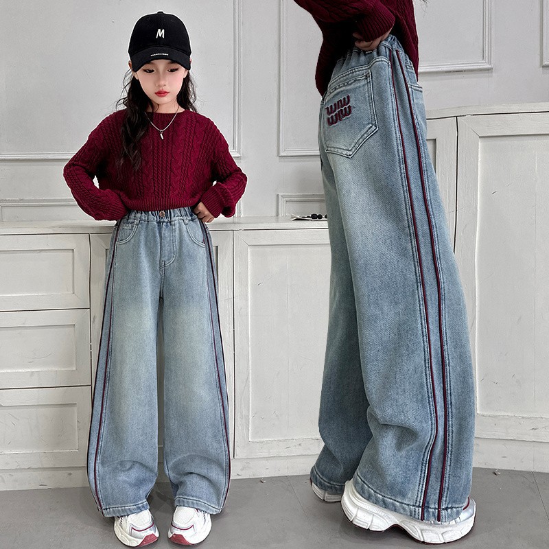 女の子用カジュアルデニムパンツ 春秋モデル 2026年新作 女児・中高生向けストレートパンツ 春用長ズボン 裏起毛 おしゃれ