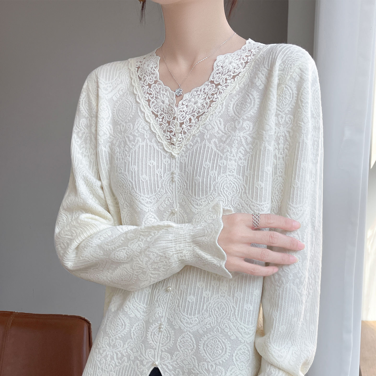 法式V领花边蕾丝打底衫女秋冬2025新款小香风设计感长袖上衣
